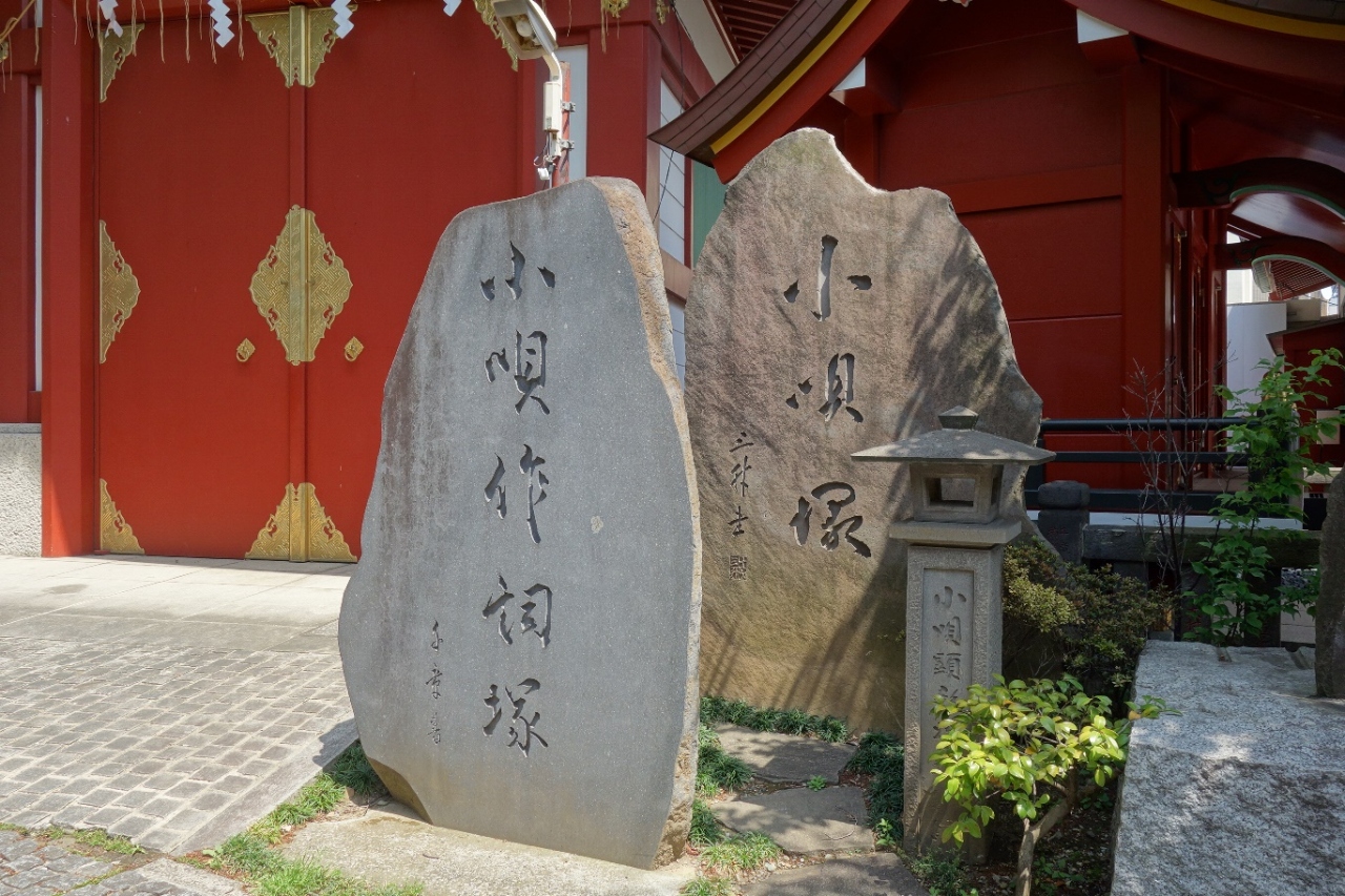 蔵前橋側から裏参道の急な石段を上がって鳥居をくぐり神田明神の境内へ入ると末社が並んでいる近く、駐車場の前あたりにこちらのいくつかの石塚がありました。案内板によれば小唄は江戸小唄のことだそうで、唄や作詞家を讃えるためにこちらの石碑が置かれたのだそうです。