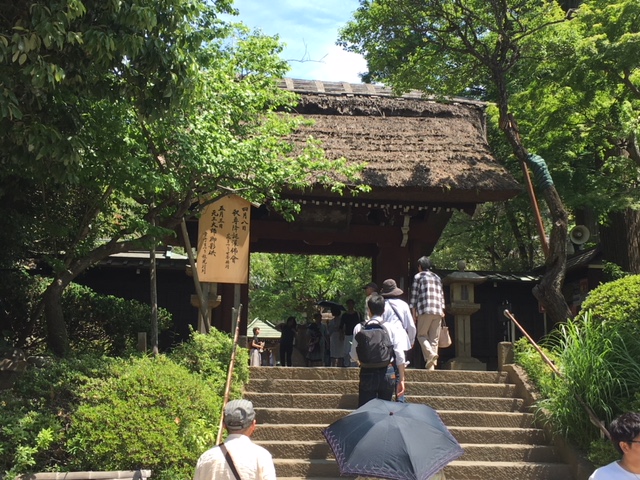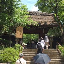銚子駅から京王バスに乗って深大寺バス停で下車しました。ここから深大寺の参道が始まります。参道に入って鬼太郎茶屋 などに立ち寄りながら進んで行くと、目の前にこの山門が現れました。茅葺屋根の地味な感じの山門で、逆に印象深かったです。