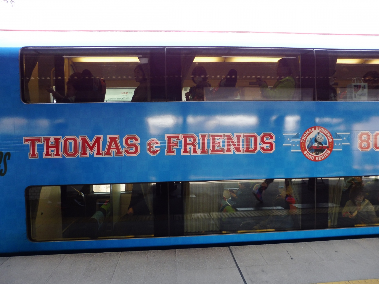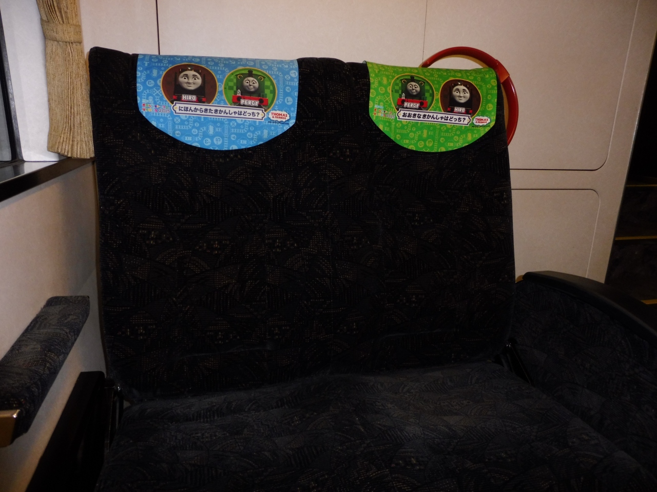 丁度入線して来た特急が来たトーマストレインで外装は機関車トーマスのイラスト、社内座席にもトーマスのキャラクターの列車達があちこちに・・・