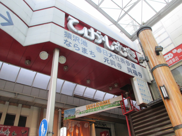 近鉄奈良駅を降りてすぐにある商店街です。文字通りに東を向いているので、東向き商店街というそうです。ここは、完全に都会なので、マクドナルドやミスドといったチェーン店もたくさん入っています。マックの前に奈良のゆるキャラがいて奈良だなあと感じました。