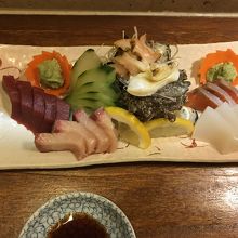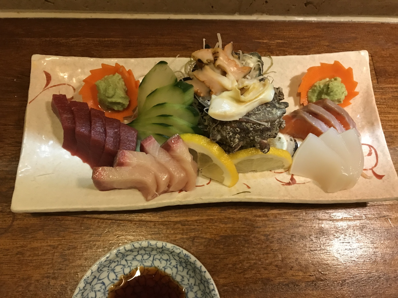 地元タクシーの運転手の紹介で安くて美味しいとのことで入店。一番人気の刺身盛り合わせと豆腐のガーリック揚げを注文しました。(もちろんビールも)。注文して3分ほどで刺し盛りが出て来ました。(餃子の王将の餃子並みの速さ)。食べたのですが、身に締まりがなく味もイマイチです。あまりにも早いので、作り置き? 作りすぎで余ったのが置いてあって出して来た?とも思えました。