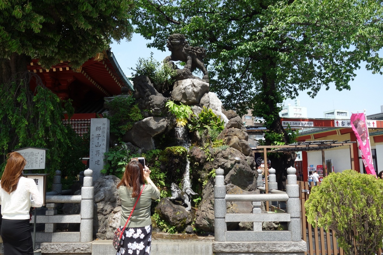 神田明神を訪れ御神殿で参拝を済ませた後、右手前あたりに岩山へ獅子が乗ったモニュメントを見つけました。石造りの獅子は大変迫力があり荒々しく積み上げられた岩の上からこちらを見下ろしているようでした。観光客がひっきりなしに写真を撮っていました。
