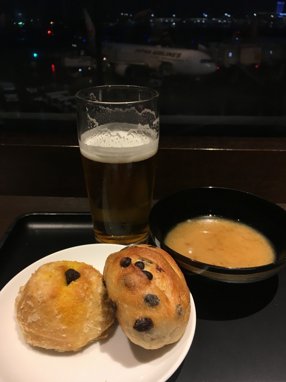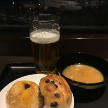 平日19時過ぎは搭乗前のひと休みと腹ごしらえをする人で賑わっていました。ビールはアサヒ熟撰やサントリープレムアムモルツ、オリジナルの焼きカレーパンにメゾンカイザーのパン二種とおにぎり三種、トマトポタージュスープと味噌汁。炭水化物ばかりですが飛行機を見ながら美味しくいただきました。夕刻のせいか長居している人は少なかったです。