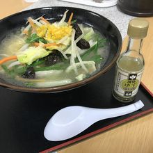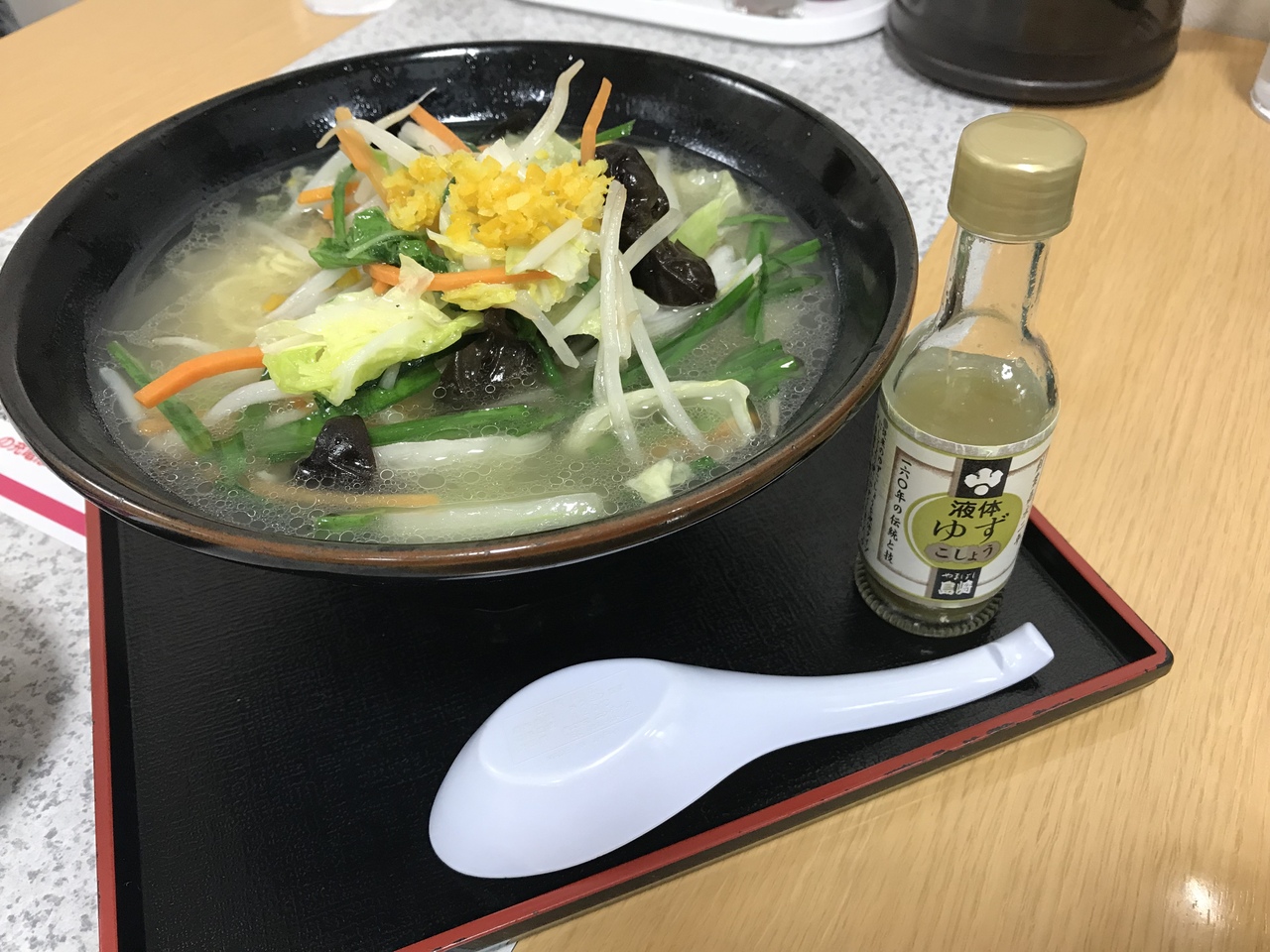 それほどお腹がすいていなかったので、ラーメンを。塩ラーメンに柚子コショウ(液体のもの)がついてきて、野菜たっぷりでした。