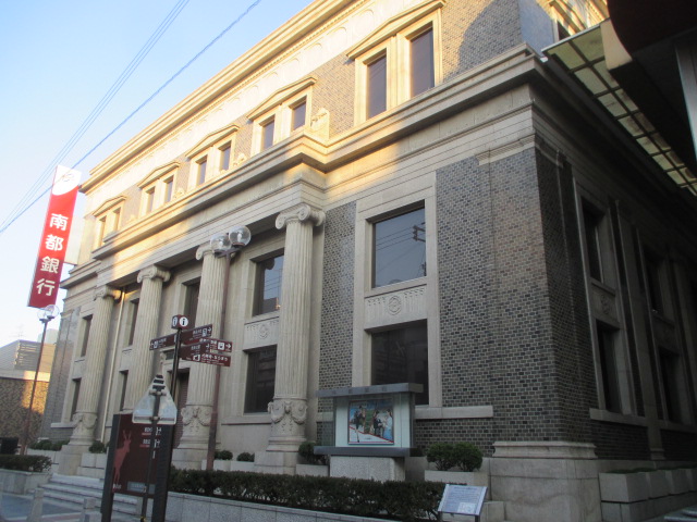 奈良に住んでいたら、数多くの南都銀行を知っていますが、ほとんどが機能的な無機質な建物ですが、こちらの本店と橿原市の今井町の支店は見る価値があります。この本店はヨーロッパでよく見かける重厚な造りで、壁もモザイク状になっていて素敵です。