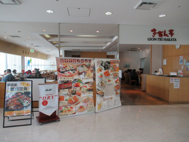 今回はここ福岡空港から香港へ出発しました。時間があったので4Fヘ、ここには4軒のお店がありそのひとつが「ぎおん亭 空港店」です。メニューはバラエティー豊かで、お寿司や天ぷらお蕎麦などの和食御膳、松花堂御膳も。またボリュームある定食やカレー、軽食もあります。