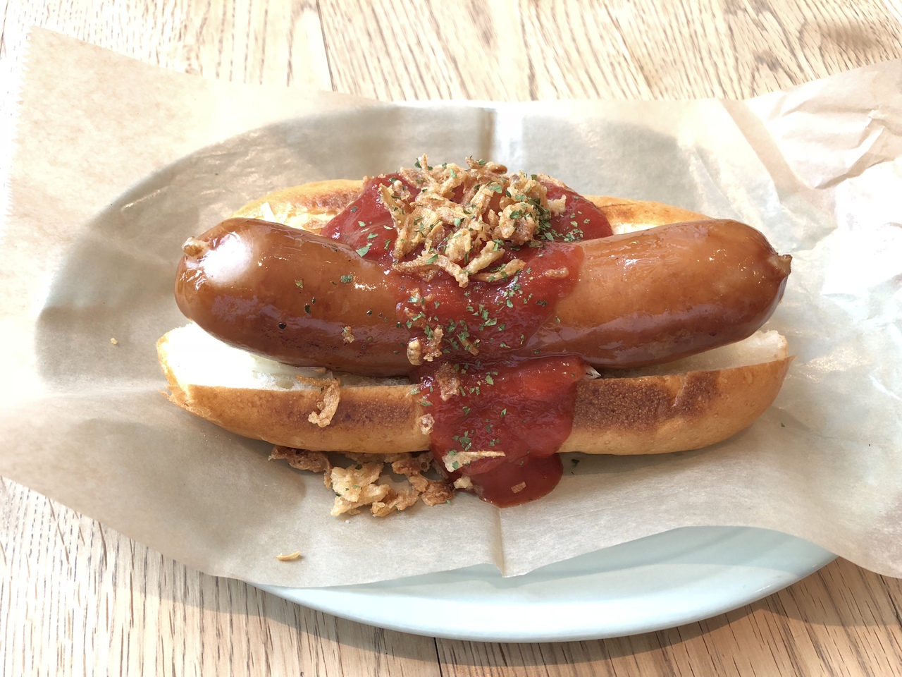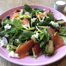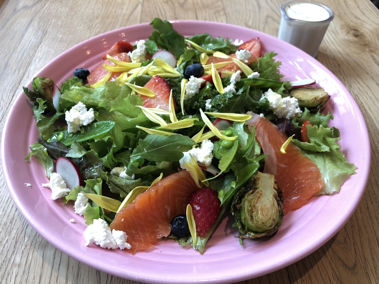 今回はサーモン、苺、フライド芽キャベツのガーデンサラダを注文、サーモンはマリネでブルーベリーやチーズも散らされて、全体的にとても好みで良かったです。連れの頼んだビッグマウスホットドッグは、たしかにウィンナーはビッグサイズでしたが、ボリュームは控えめで、男性にはおやつくらいの分量だったようです。