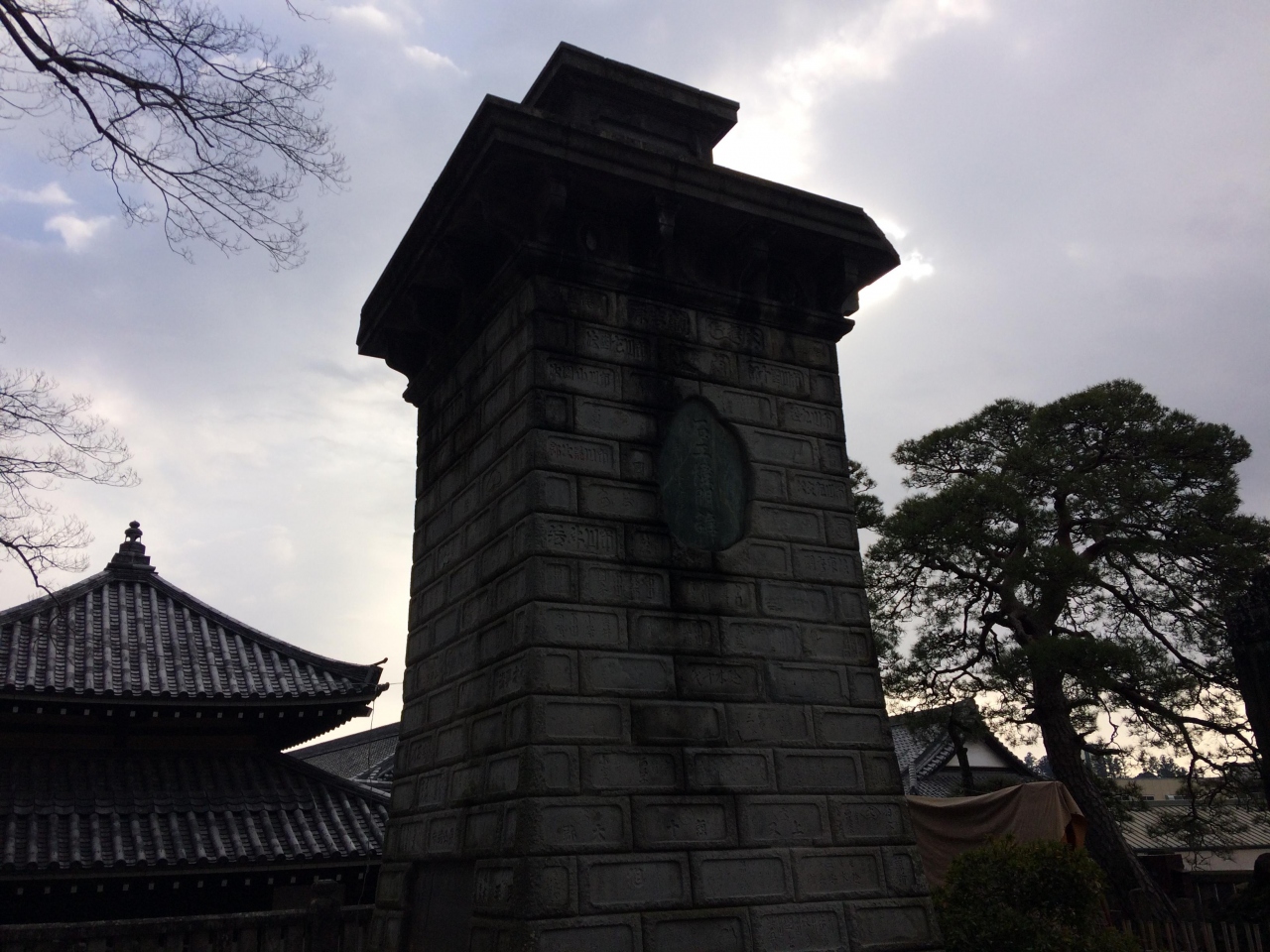 成田山新勝寺の総門をくぐりぬけて仁王門の手前を左に折れたところにあります。一般的な参拝ルートからやや外れている場所に位置しているため、この灯明台に長年気付いていませんでした。関東大震災の影響で塔の上部の灯明部分が崩れ、今でもそれがなく なってしまっています。台座に多数の寄進者とともに歌舞伎で有名な市川団十郎の名前がありました。