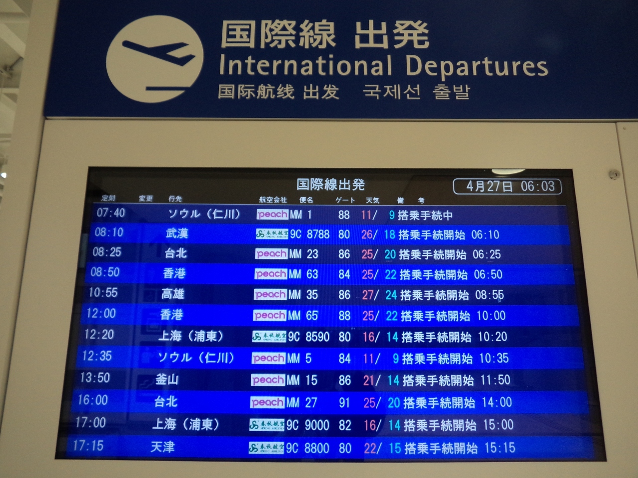 今回、LCC国際線しか使っていないので、そちらのターミナルしか分かりませんが、Peachと春秋航空しかないようで、Peachは搭乗口も1か所のみ。