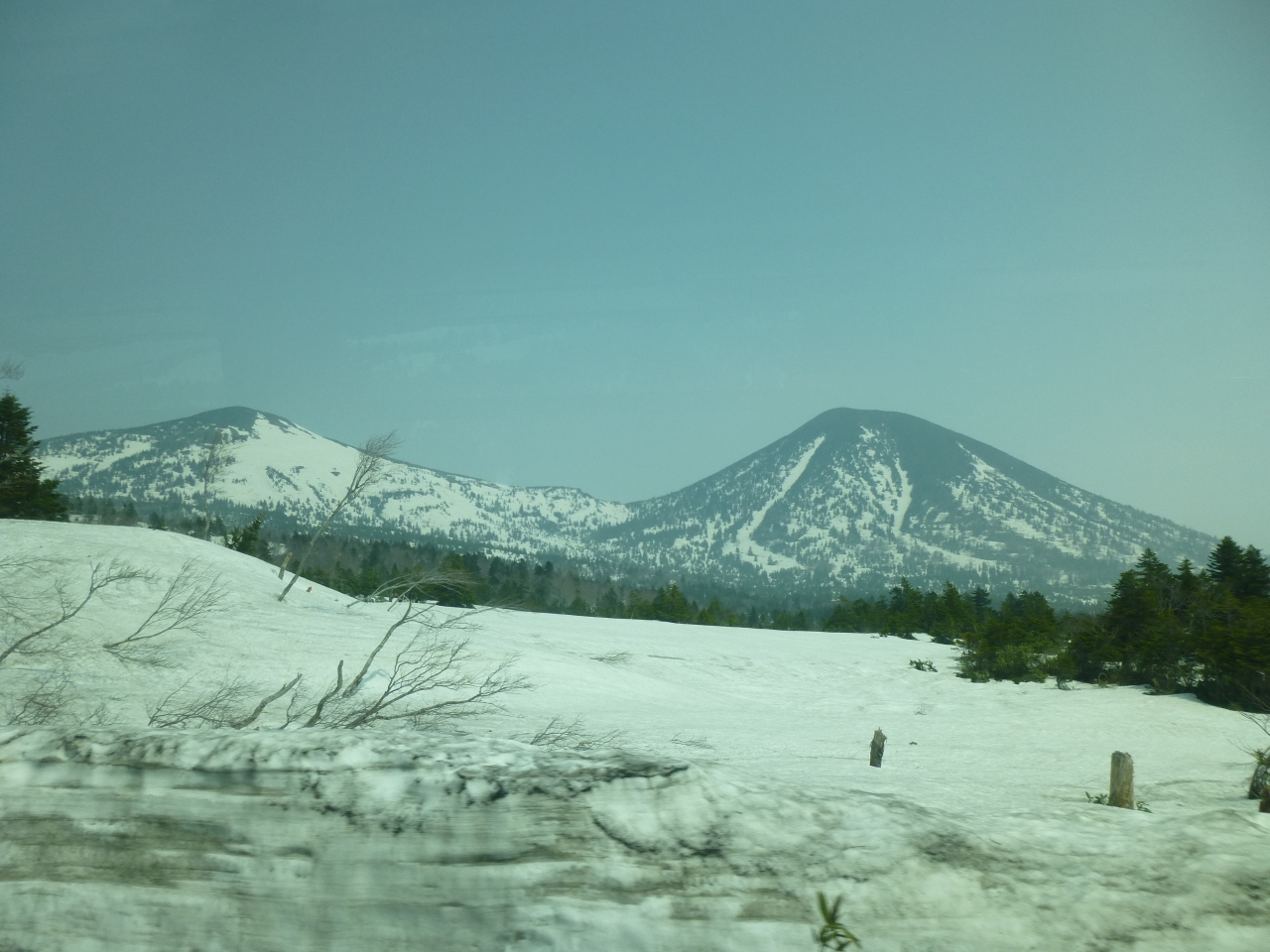 雪の回廊を出て、雪原に入って行ったら、すっかり晴れていて、雪を頂いた八甲田の山々がドーンと見えてくれた。兜の格好をした山々という意味で付けられたと初めて知った。なんとも美しいが、あの悲劇の話を聞くと鎮魂の山姿という気もしてくる。