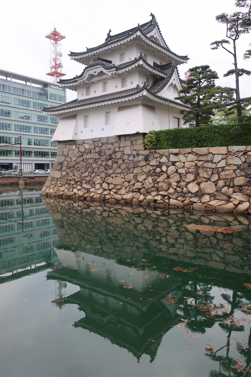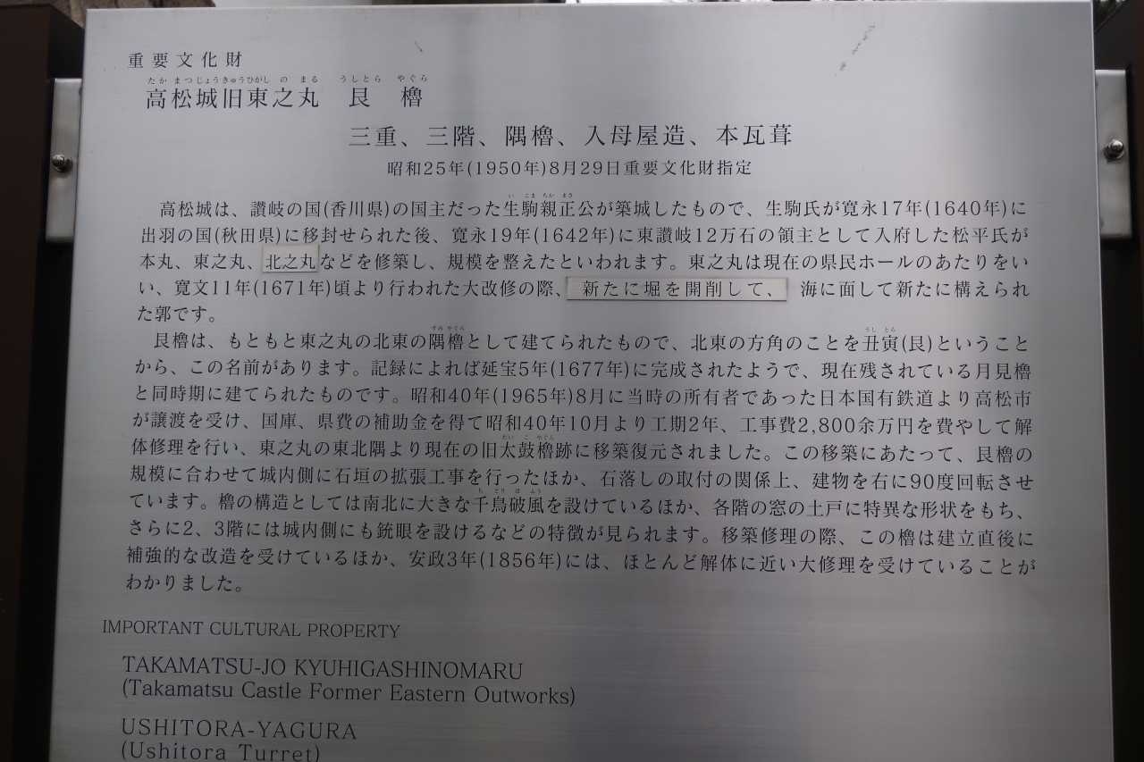 玉藻公園の南東の中堀の角に建つ櫓蔵が高松城跡 艮櫓です。艮とかいて「うしとら」と呼び、丑寅の方角つまり高松城の北東の鬼門を護る櫓です。そこで?と思うのは現在の場所は南東なのに何故です。