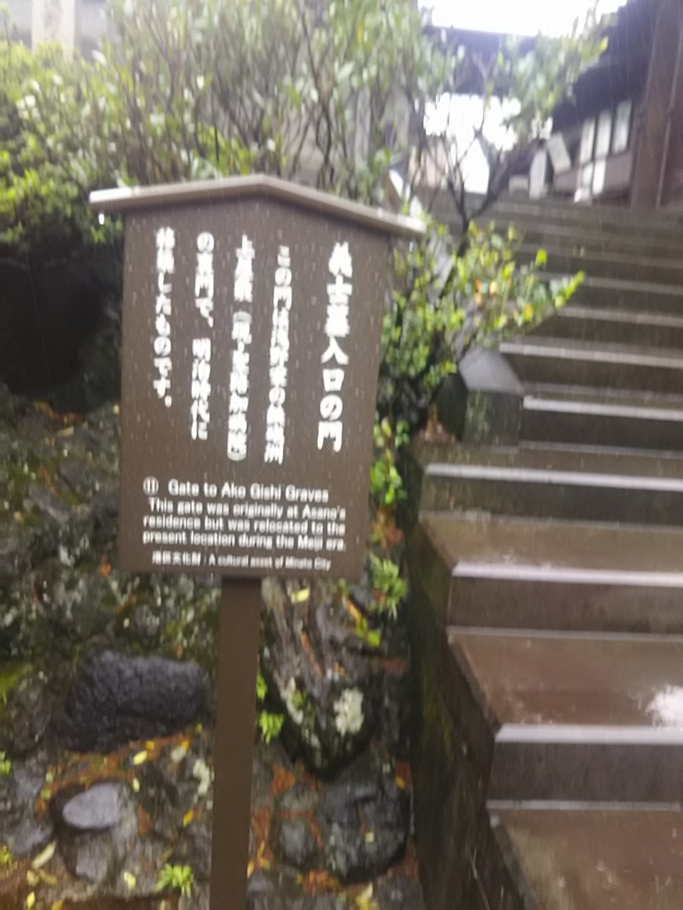泉岳寺の大きな門の二つをくぐり左左手に行くと赤穂浪士の主人公たちのお墓がありますそこの入り口にこちらの案内が掲示されていました ここから階段に登り奥に向かうと赤穂浪士の方々のお墓があります 入り口でお線香が販売されているので利用されるといいと思います