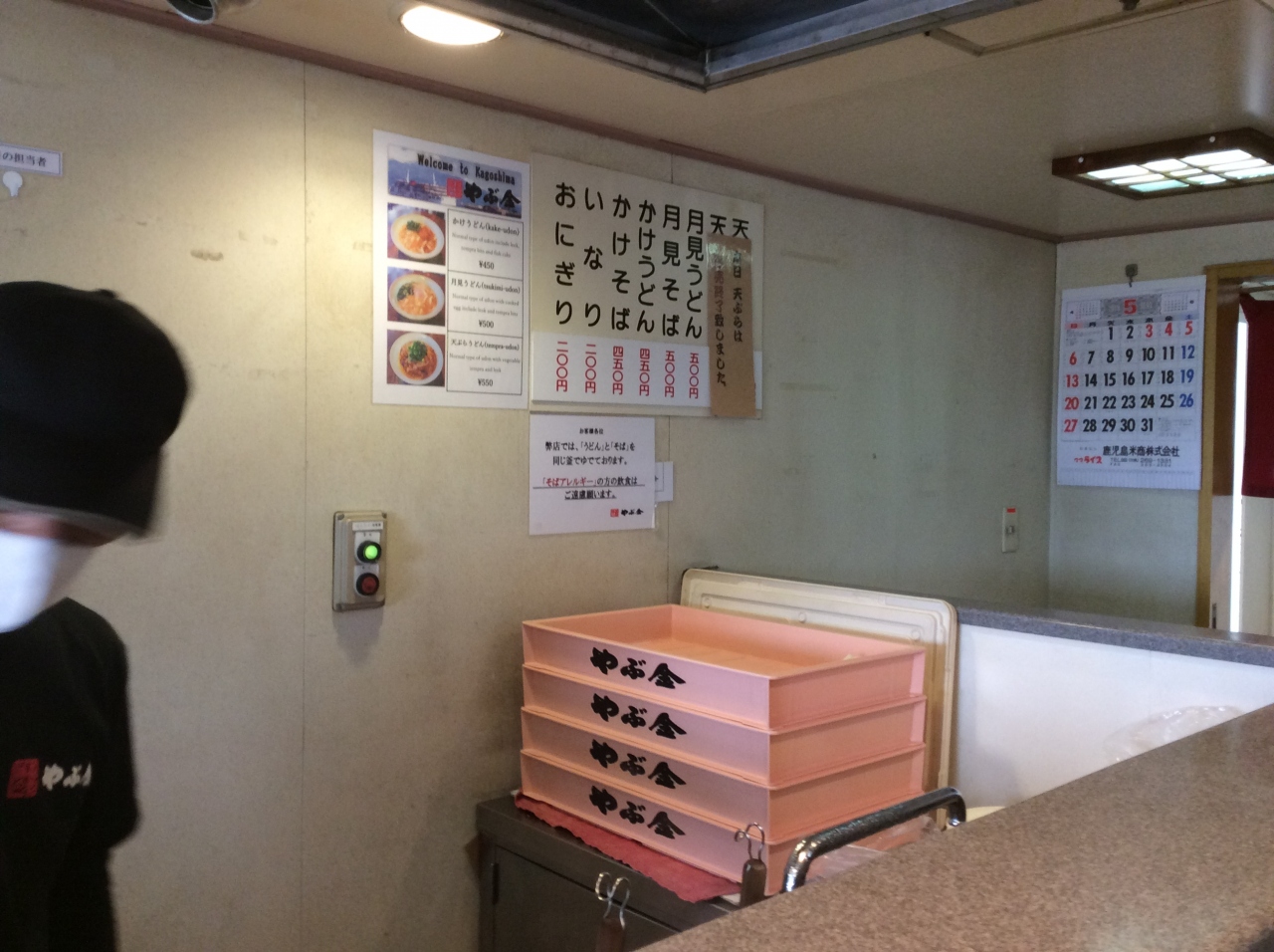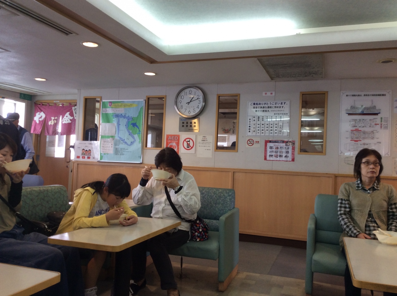 - 一人だけだったので、荷物を持ったままお金払って、うどんの薬味をかけて、揺れる船の中席に着く。どんくさい人は友達の荷物番へ回ったほうがいい。