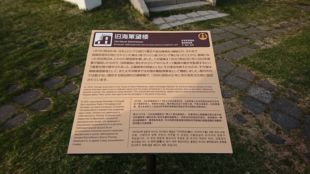 1875年に締結された樺太千島交換条約により樺太(サハリン)がロシア領になり、宗谷岬が国境となったことから建設された望楼。当時最強と言われたバルテック艦隊の動きを監視することが目的で、日露戦争終結後は無線通信基地として機能したとのこと。ここ宗谷岬は、サハリンまで43キロ、稚内市内まで31キロという、ロシアが近いことを示す建物。宗谷岬を見た後の歴史勉強も悪くない。