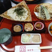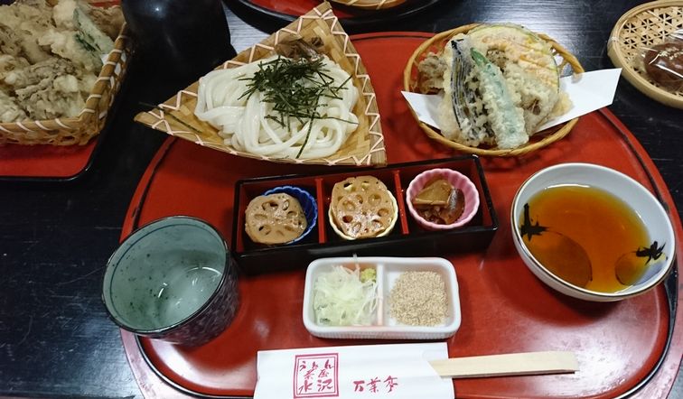 伊香保温泉に行く途中に別のお店で水沢うどんを食べる予定にしてましたが、駐車待ちの車の列ができていたので諦めてこちらにしました。駐車場は広くすぐに停めることができましたが、40分ぐらい待ち席に案内されました。お茶に「湯の花まんじゅう」が付いてきました。三大うどん(?)として期待してた水沢うどん、茹ですぎでしょうか?こしがなくとても…。つゆも好みではありませんでした。別に頼んだ舞茸のてんぷらは大きくとても美味しかったです。