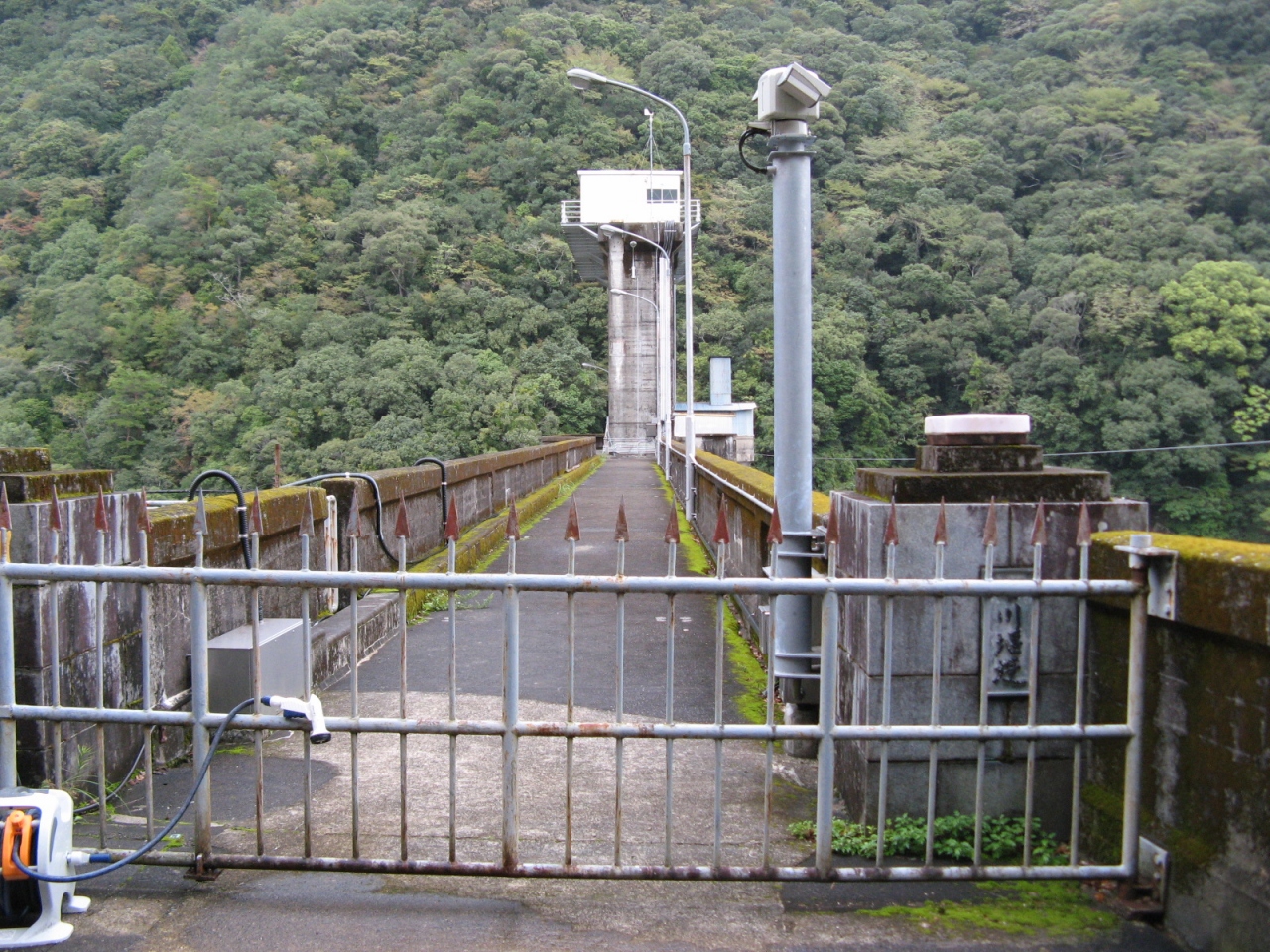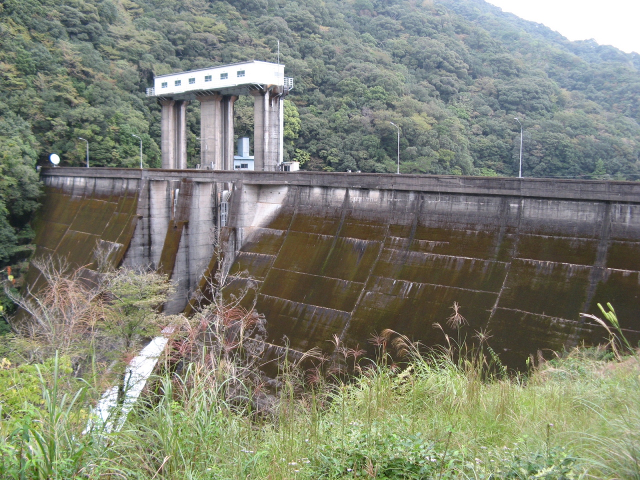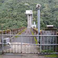 竣工が1956年と比較的古く、クレストゲートがあるシンプルな構造のダムは、堤体が苔むしていて風格があります。残念ながらダムサイトには柵が設けられていてダム堤体上を通行することができず、ダム堤体上から下流側を覗くことができませんでした。
