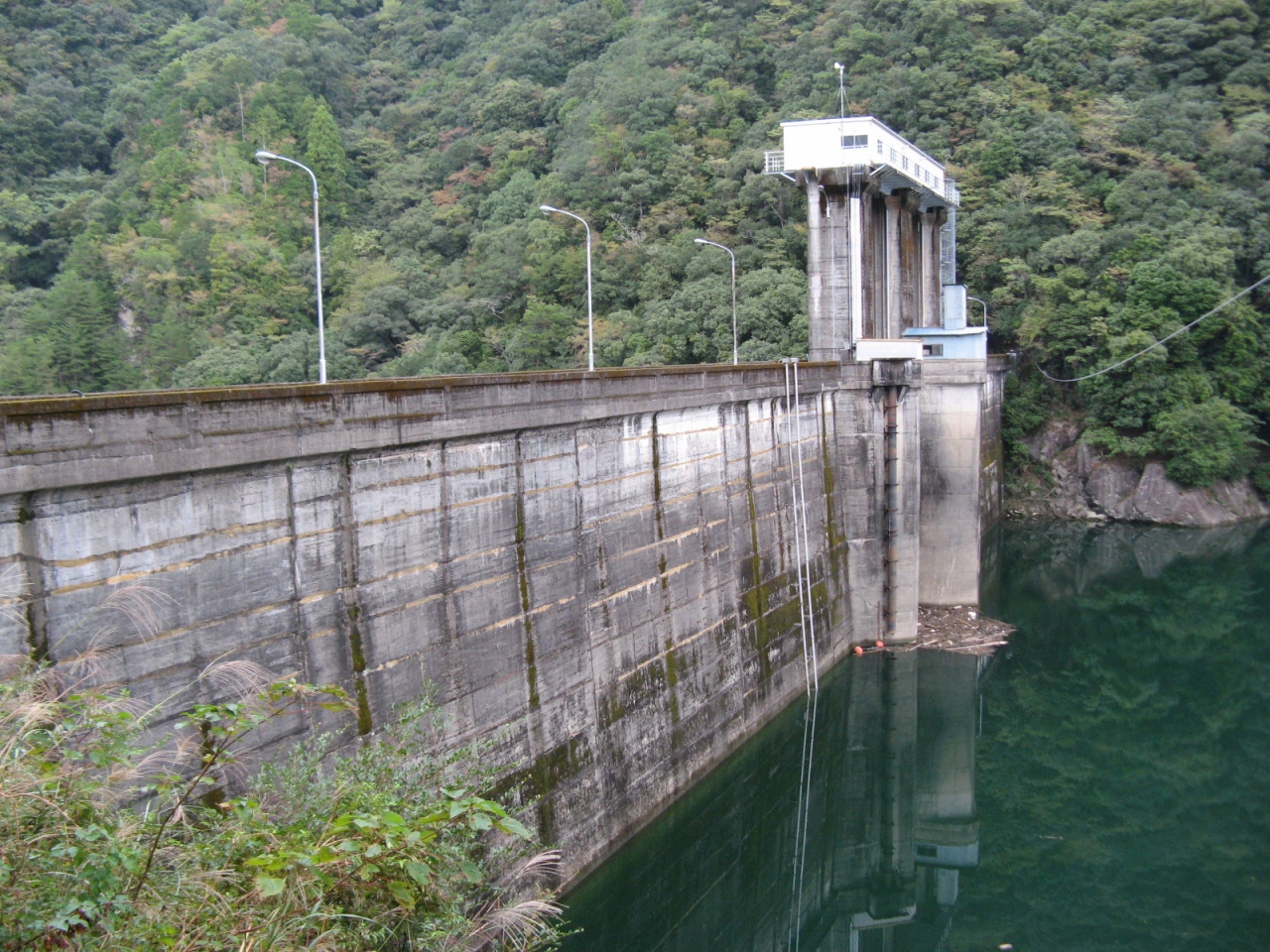 七川ダムは洪水調節と発電を目的とした、堤高58.5m、堤頂長154mの重力式コンクリートダムです。