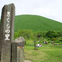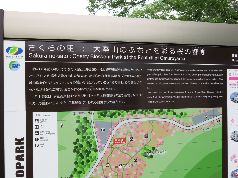 訪れた時は既に桜の季節は終わっていましたが、園地の新緑と背景の大室山の緑がとても良い風景を作っていました。