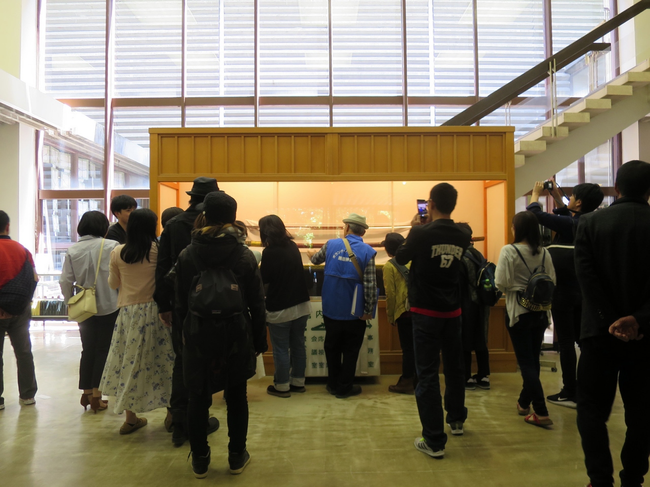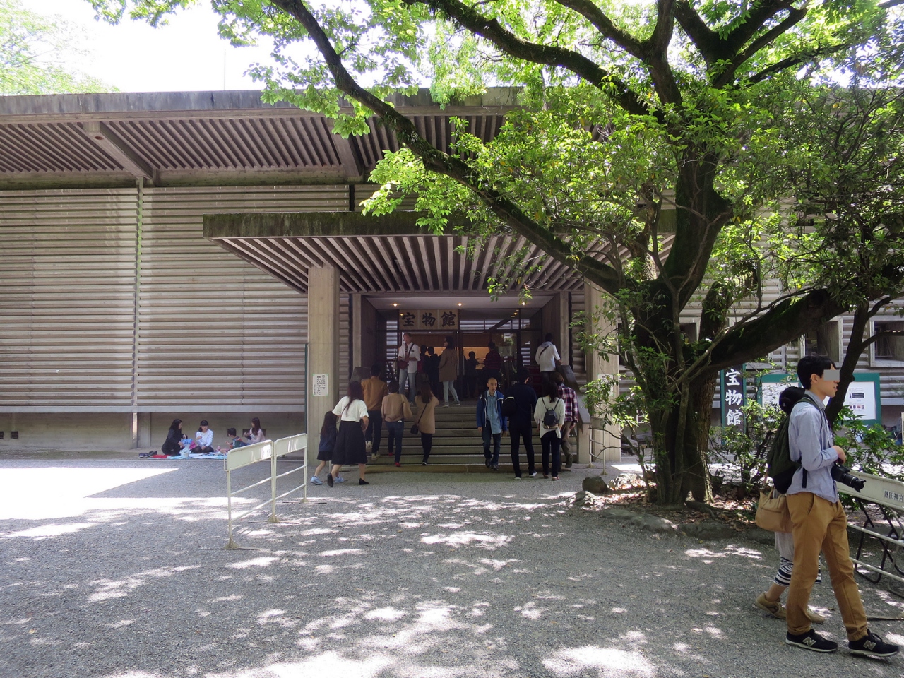 数年ぶり2度目の訪問です。今回はGW期間中ということで「熱田神宮」は激混み。この「宝物館」周辺も、開催中の写生大会の本部があったり、ガールスカウトの子供たちが何かの板切れを持って大きな声を出していたりと喧騒の中でした。玄関を入った正面のガラスケースには3メートルほどもある太刀が展示されていて、この前は大混雑。300円を支払って入った「宝物館」も、前回とは比べ物にならないほどの人出がありましたが、まあ問題はありませんでした。展示室の3分の1ほどは刀剣の展示ですので、その辺り刀剣方面に造詣のない私にとっては、ちょっと難しかったです。市井の人々は郷土三英傑や源頼朝絡みの展示を期待していると思うのですが、そっち関係の展示もあるのかな?