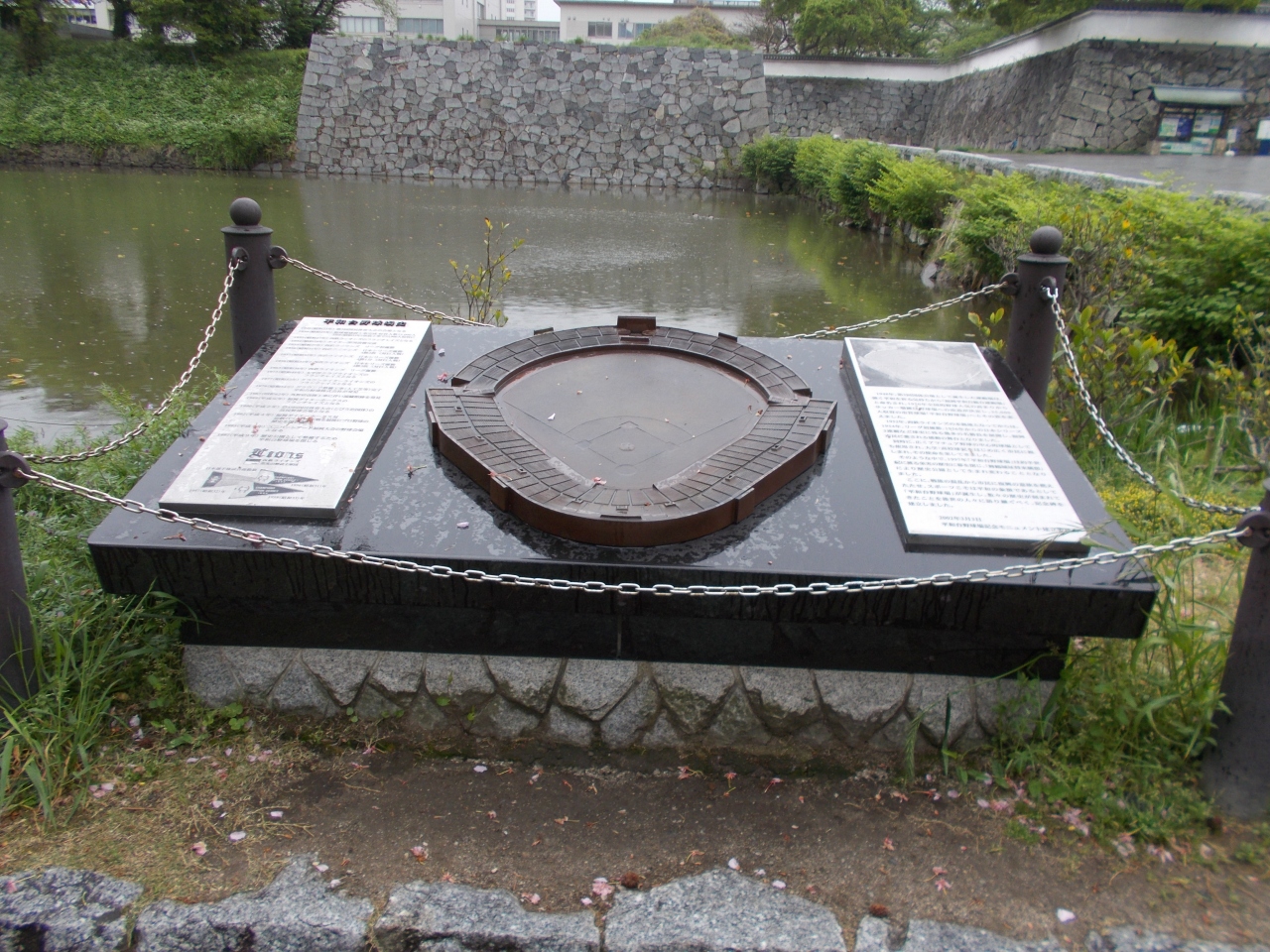 この平和台球場モニュメントはかつての球場があった城内ではなく上ノ橋御門がある堀の外にあります。球場の上空からの姿を見せています。平和台球場は1949年に開業しました。その前年の第3回国民体育大会のサッカー会場として建設されたのを改修したのです。その後ナイター施設などを取り付けて1997年目までプロ野球の球場として使われました。今は歴史的な公園へと変身しています。