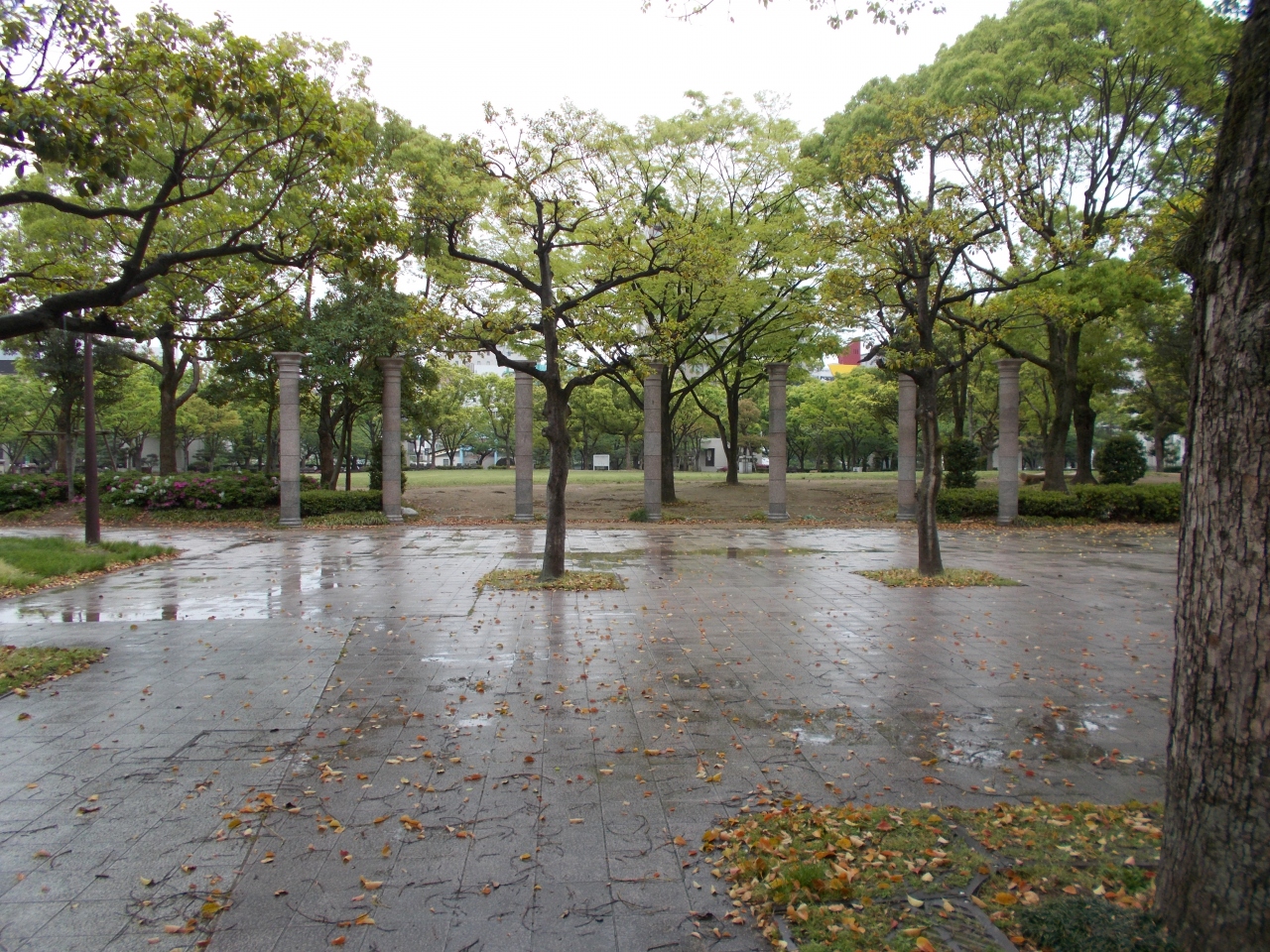 この公園は県営の公園で芝生の公園です。この公園の北側にはアクロス福岡の施設があります。西側には福岡市役所があります。市役所の15階の展望フロアーから公園の全貌が見れます。東側は那珂川の支流の薬院新川です。公園の中にはギリシャ・ローマの円柱が作られていてふと外国の公園のように感じました。