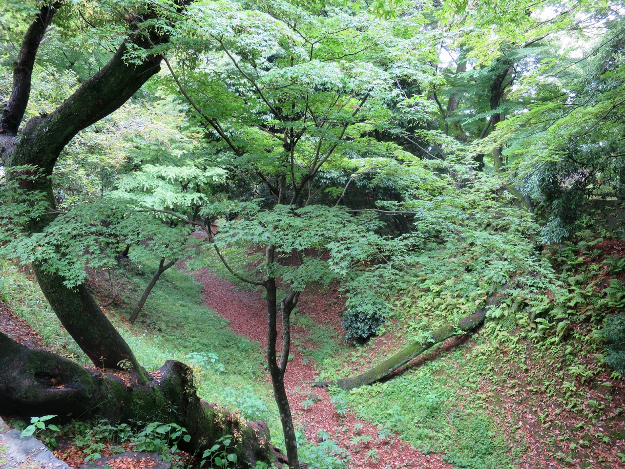 念願の「岡崎城」です。徳川家康誕生の地であり、徳川家の三河での拠点であった城です。現在の城郭は、家康が江戸に国替えになった後に城主となった田中吉政の時代から整備がすすめられたようです。元は乙川と矢作川を天然の要害として建てられたとのことですし、現在の復興天守の大きさなどからは、とても5万石の城とは思えないほどの大きさです。ここで初めて目にしたのは弧を描く空堀、これは一見の価値があります。土塁、腰巻石垣など、城を攻める武将の視点で見ると楽しめるほど、各所に遺構が残っていました。天守閣内は史料館になっていますが、5階の展望台には逆ビスタラインを楽しめるよう「大樹寺」に方向を固定された望遠鏡がありました。
