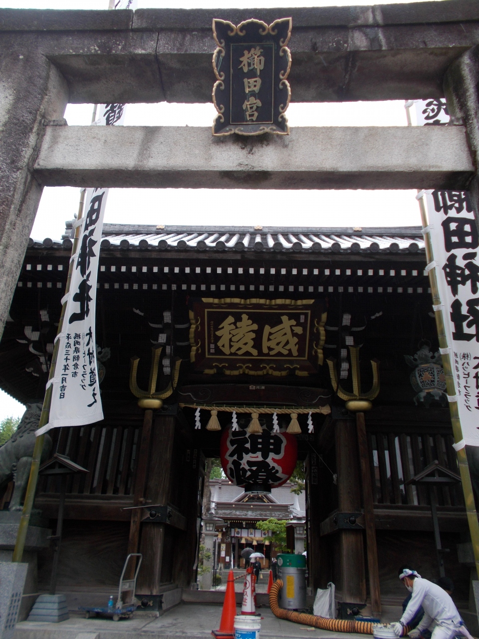 この櫛田神社の楼門は大きさは普通ですが手の込んだものです。その表れの一つが門をくぐると天井に干支恵方盤があります。干支で方向を示しています。また門の両脇にある狛犬が特徴的で犬のようで狐に見えてきます。門や狛犬や恵方盤など見所がある門です。