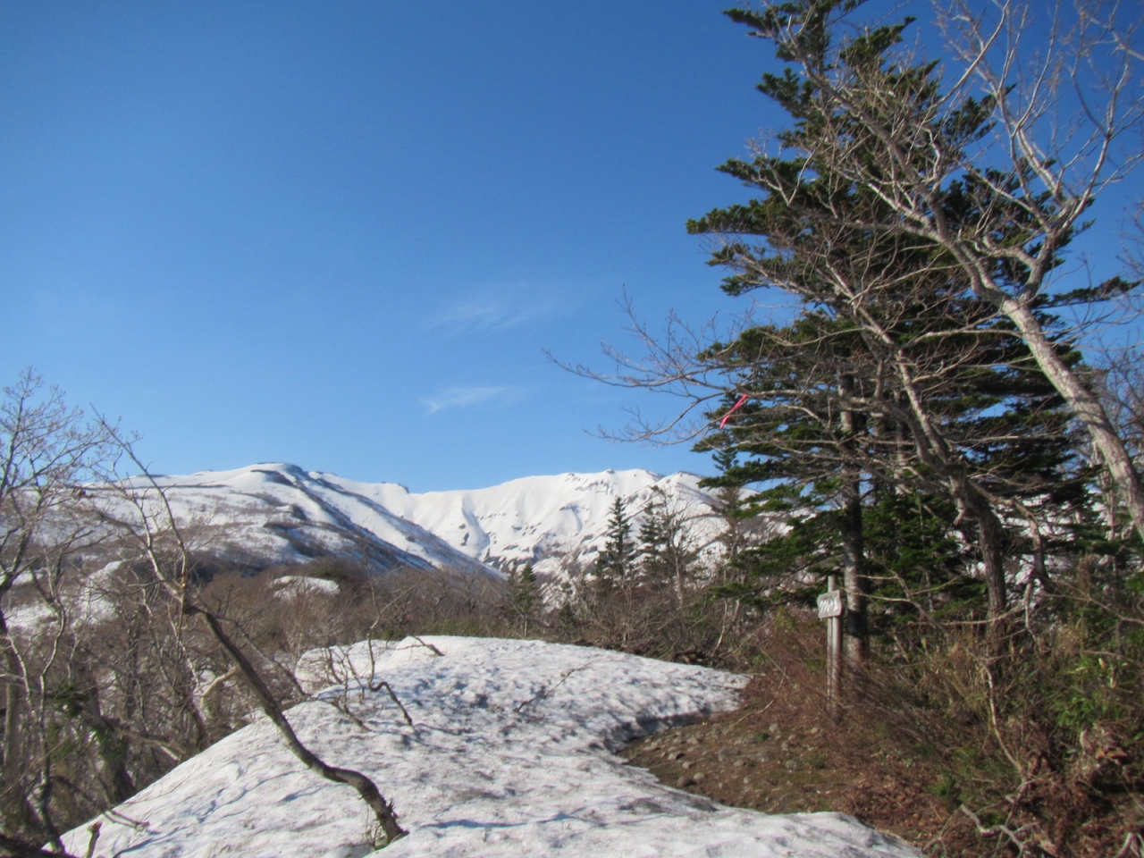 訪れた5月中旬は、雪が減ってきていて、稜線の一部が露出しているが、この登山コースの場合、登山道(尾根)の左手は雪が吹きだまっていて、積雪面が山頂台地直下から麓付近までずっと繋がっていた。