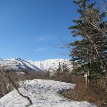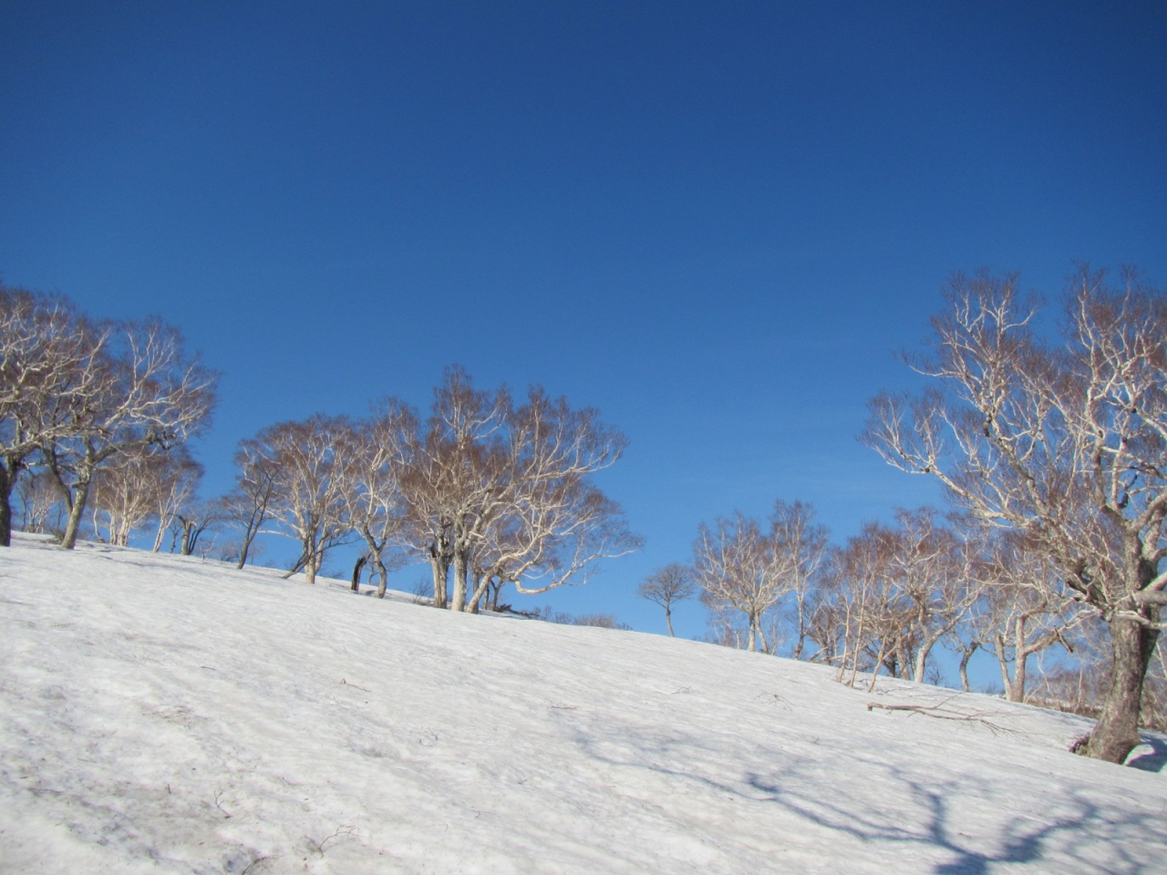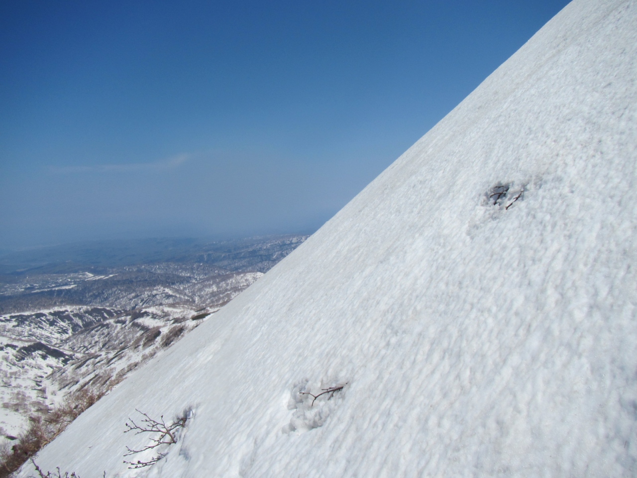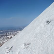 バックカントリーが楽しめるのは、台地直下から2合目、つづじヶ丘付近までのようである(山頂付近はかなり溶けていた)。