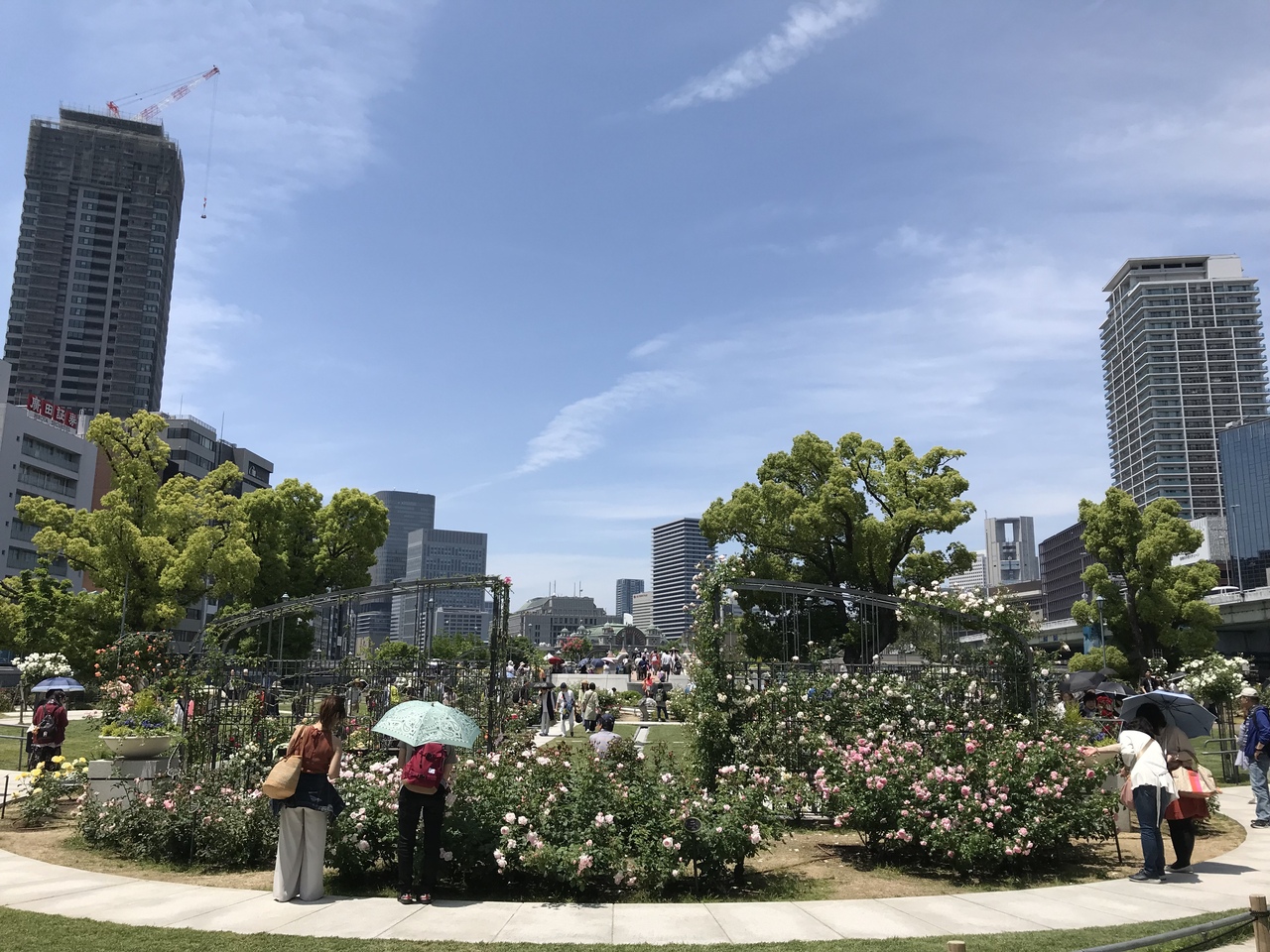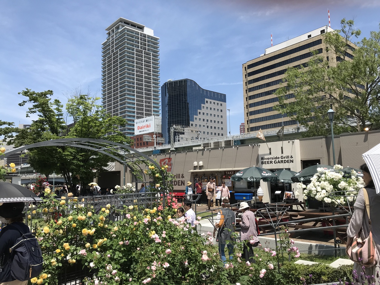 ここは京阪電車 北浜駅もしくは なにわ橋のから直ぐの公園にあるバラ園です。