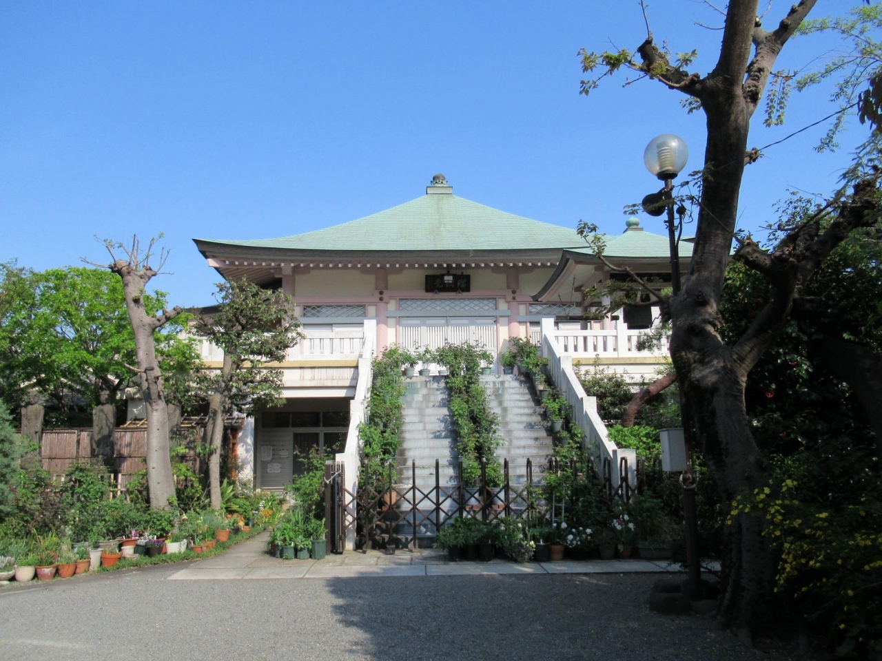 都電荒川線・面影橋駅の北側で豊島区高田1丁目の静かな住宅地にある真言宗豊山派の寺院で、見るものがいろいろありそうだが鉢植えの草花が目立っています。