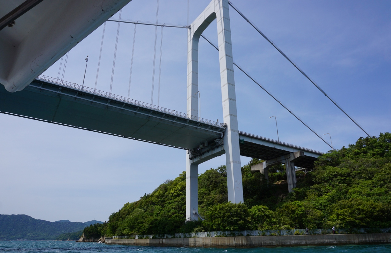 今治からしまなみ海道をすすむと、最初の島である大島と2番目の島である伯方島を結ぶ2つの吊り橋です。