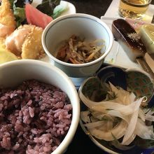 古代米と田楽とフライの盛り合わせです