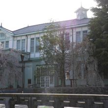 屋根のデザインなどが独特で当時のおしゃれとはこういうものだったのかなと感じた。玄関前の桜の花も満開で見事だった。