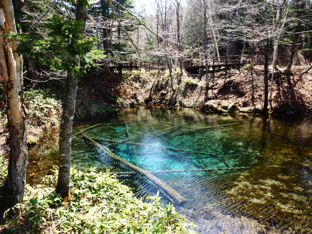 神の湖と呼ばれる摩周湖の伏流水からできているという言い伝えから「神の子池」と呼ばれている、こちらの池は、底まで見えるコバルトブルーの青い池として有名です。
