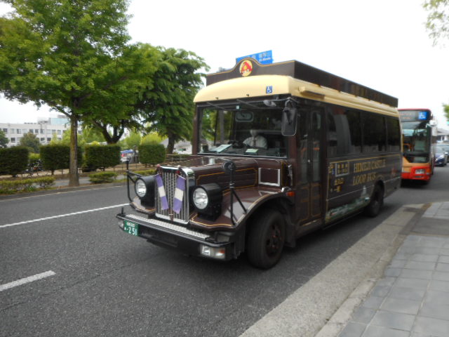姫路城に行くには姫路の駅からけっこう距離があるので、このループバスは気軽に利用できて便利な移動手段です。橋事態も茶色のかわいらしい車体です。ワンコイン(100円)で乗れますし、休日なら15分に1本走っているのでわかりやすい。1日乗車券もありました。