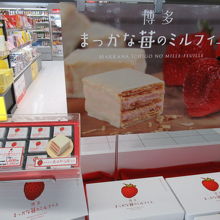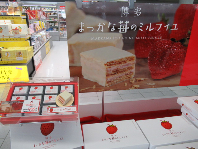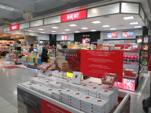 出国する方たち忘れ物はありませんか。ここは3階出発口です、もう戻れませんよ。九州各県の特徴豊かな特産品やグッズ、そして美味しいのは空港からとのコンセプトで「空弁」は人気物です。福岡はイチゴが特産品となっていますが「まっかな苺のミルフイユ」絶品です。もちろんJALカード払いでマイルUPです。