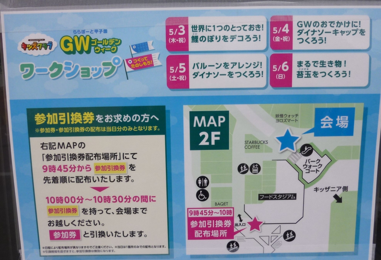GWだからこそ、混雑程々の行き馴れたお店で子どもを遊ばせてあげたい。今年のGWは、キッズクラブのイベントがGW後半の5月の4日間毎日開催です。鯉のぼりを作るこどもの日を狙ったモノから、苔玉を使った植物に触れあうモノまで、子どもだけで無く大人も一緒に楽しめました。
