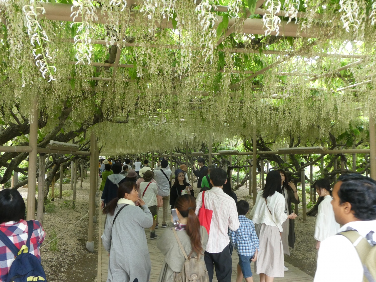 チケットを買って入ると、正面が大長藤でした。フラワーパークの観光パンフにいつも登場する長く幻想的な藤。満開時には花房が長さ100センチ以上にもなり、風に揺れる姿はフラワーパーク最大の売り物でしょう。観光パンフには米CNNが「世界の夢の旅行先」の一つとしてあしかがフラワーパークを選出。日本国内では唯一選ばれたと書いてあります。