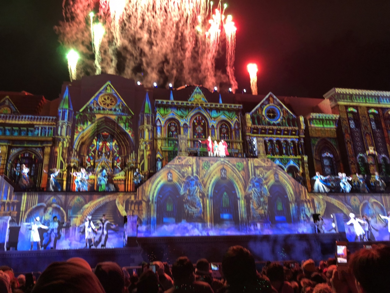 朝一番にフライングダイナソーに乗り、その後は適当にぶらぶら。夕方は天使の奇跡というクリスマスイベントを観覧しました。こちらは有料の特別観覧エリアから芝生に座って鑑賞。最後の打ち上げ花火が綺麗でした。その後、夜のハリーポッター城へ。平日ということもあって、あまり混雑してませんでした。