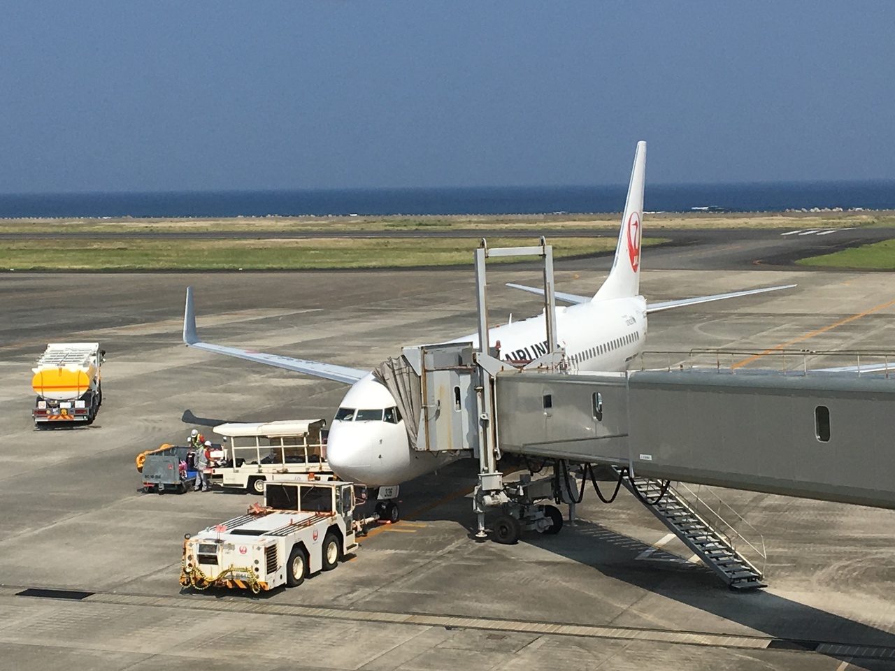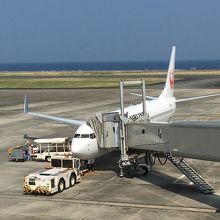 小規模な空港です。一階にチェックインカウンターと到着出口、二階が数店の土産物店とレストランぐらいでした。屋上に展望所がありました。海を埋め立ててできたため、背景に邪魔されることなく、飛行機の離発着が眺められるのが良かったです。