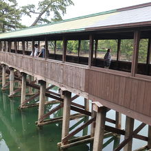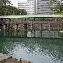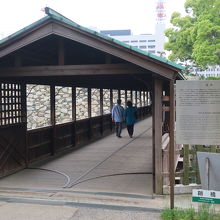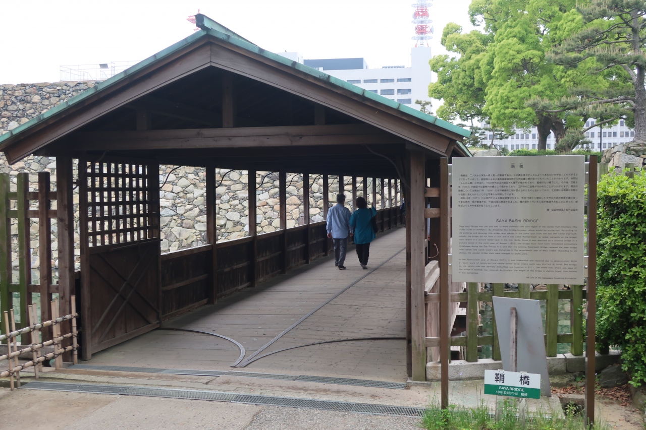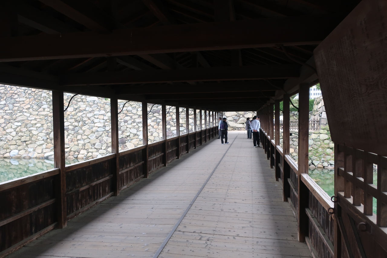 玉藻公園(高松城)の高松駅に近い入口から入り右手に行った先に高松城 鞘橋があります。鞘橋は他の城では見たことが無い屋根付きの木造の橋で、高松城の天守台に渡る唯一の橋は橋を落とすと天守に渡ることが出来なくなり、防御上重要な橋だったことが良く分かる橋です。
