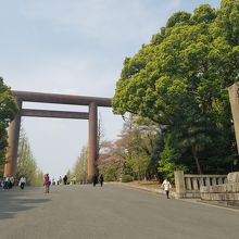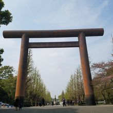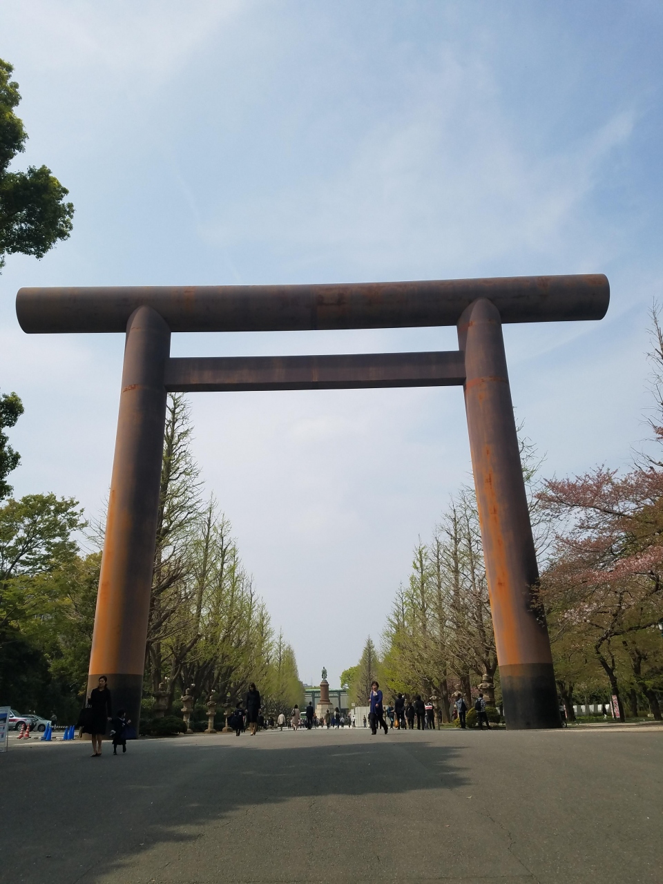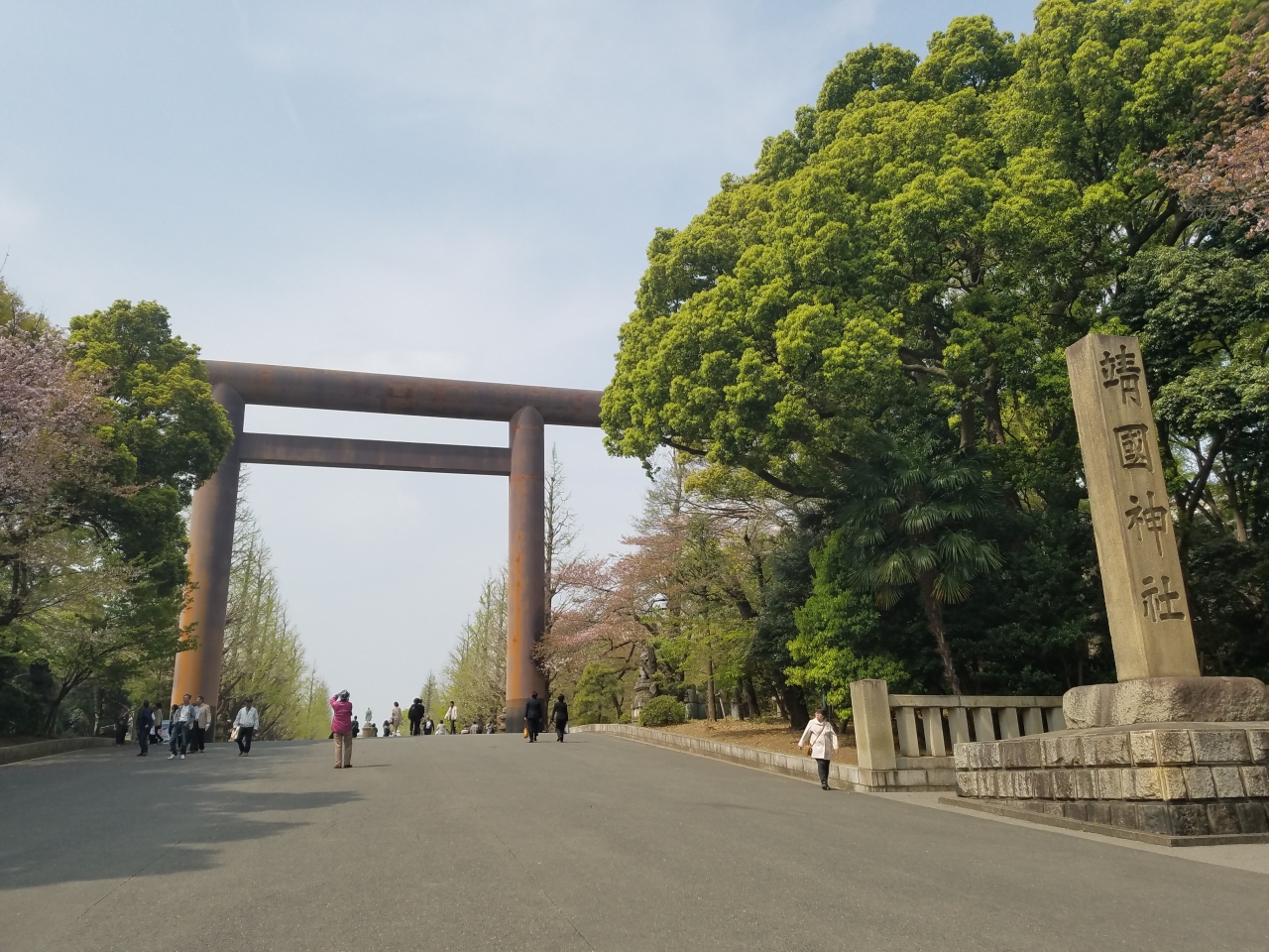 第一鳥居は、九段下交差点から靖国通りを登ったところ、靖国神社の入り口に聳え立つ巨大な鳥居です。高さ25mと国内最大級の大きさを誇る金属製の大鳥居で近づくと表面のサビも目立ちますが圧倒的な存在感で参拝者を迎えています。