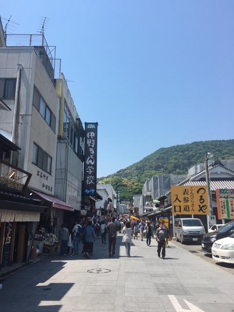 金刀比羅宮に続く参道で、両側にはお土産物屋さんから、食べ歩きができるおせんべいやソフトクリームなどを売るスイーツ屋さんがずらりと並んでいます。ゴールデンウィークだったせいもあるのか、観光客で大賑わいでした。子供があれもこれもほしいと言って大変な感じでした。