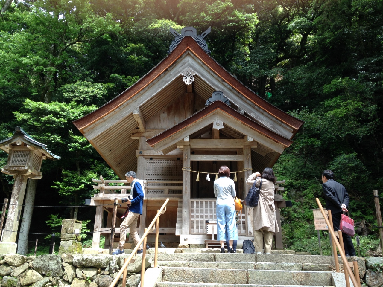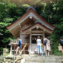 本殿の真後ろ、八雲山の麓に建っている社です。大国主大神の父神・スサノオノミコトが祀られています。社の後ろに置かれた大きな岩は、人気のパワースポットにもなっているようです。山の麓から子供である大国主大神を見守るように建っているのが印象的でした。