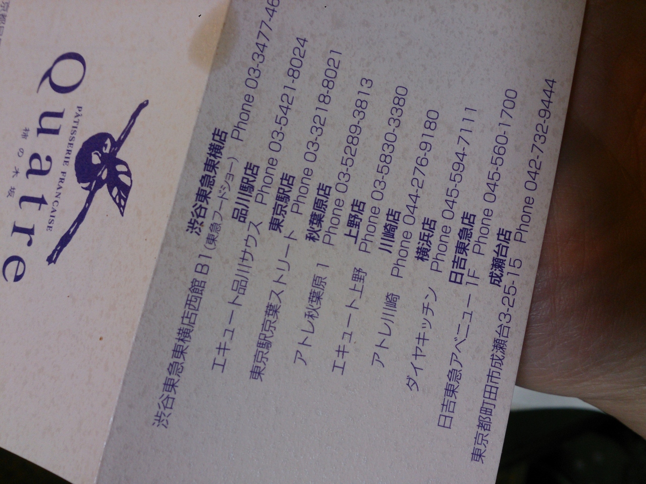 比較的一つ一つの製品が小ぶりなので取り分けるのに便利で手土産に時々利用しますが、今回箱の裏の店舗所在地に柿の木坂が無いことを発見。本店は柿の木坂だと思っていたんですが違うんですかねえ。