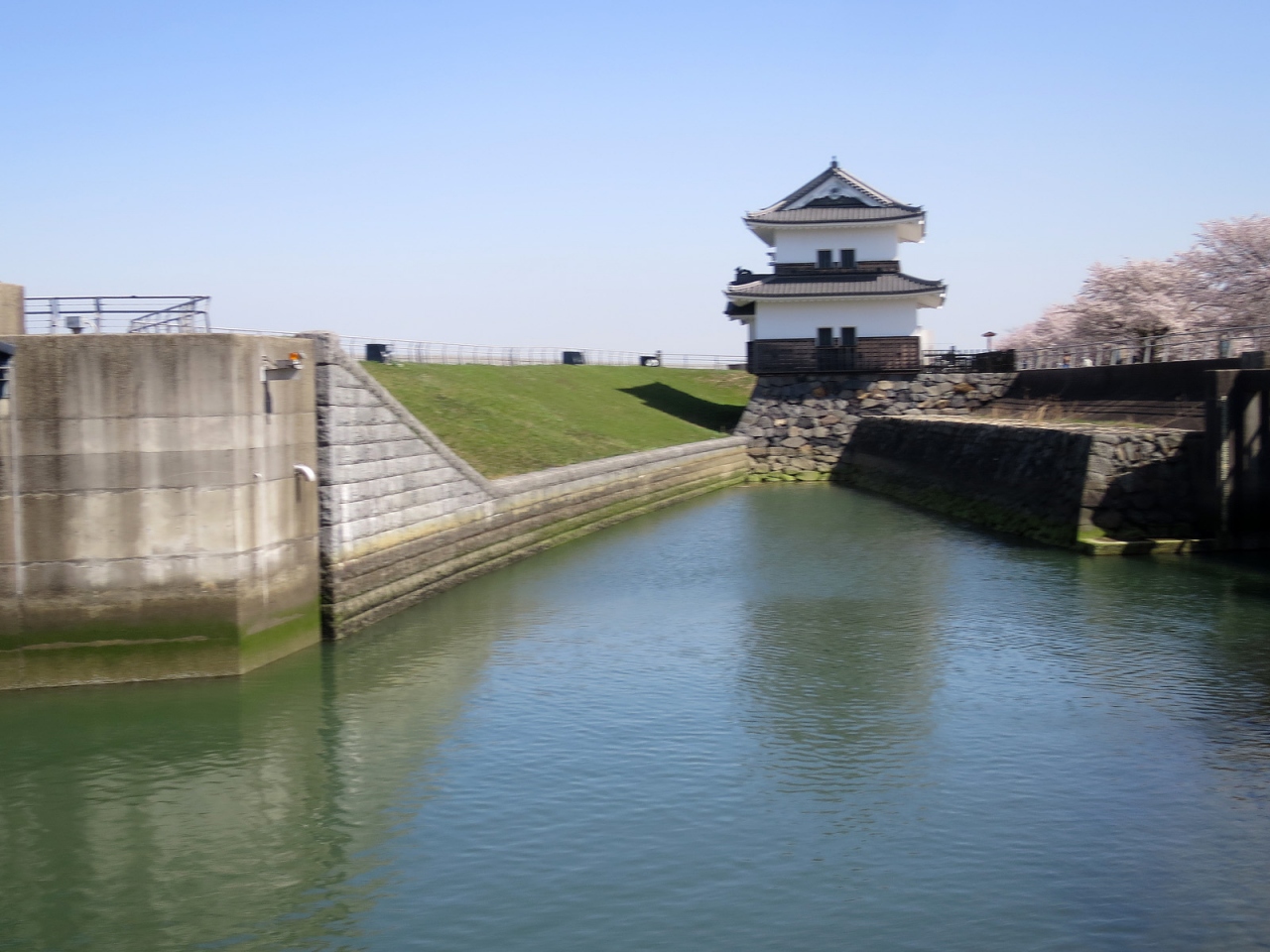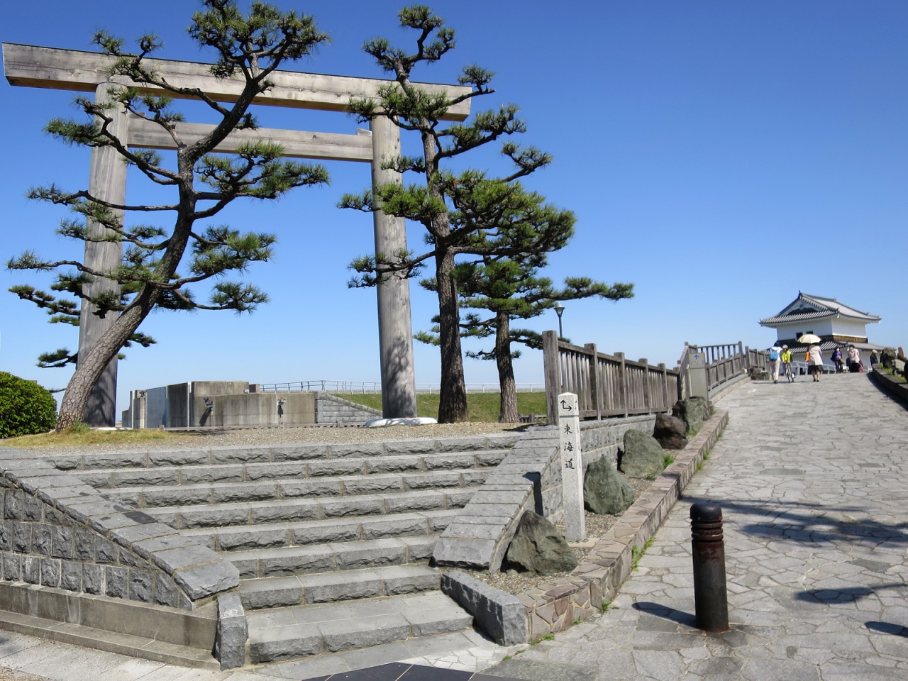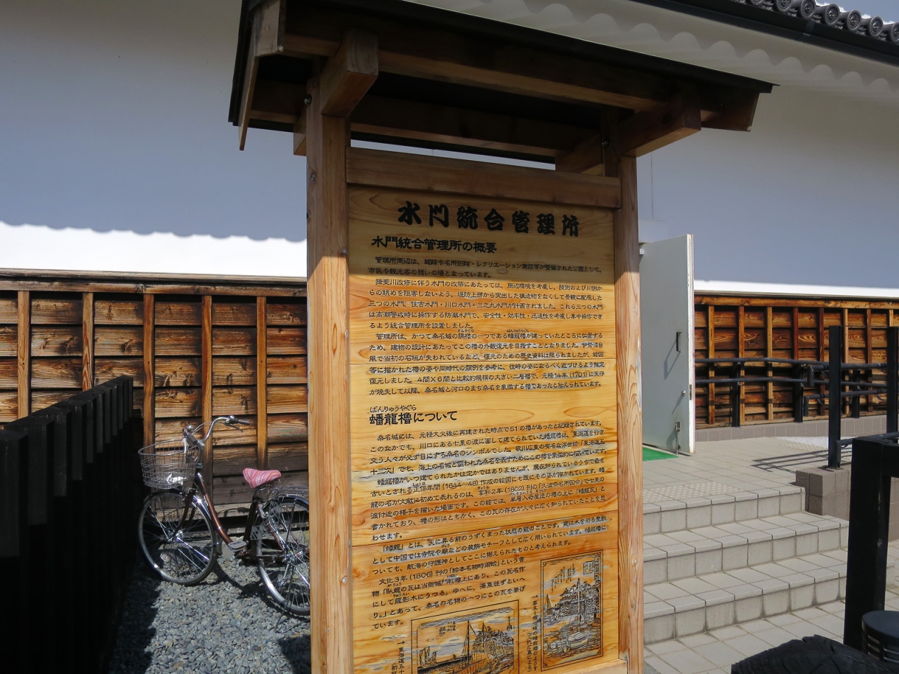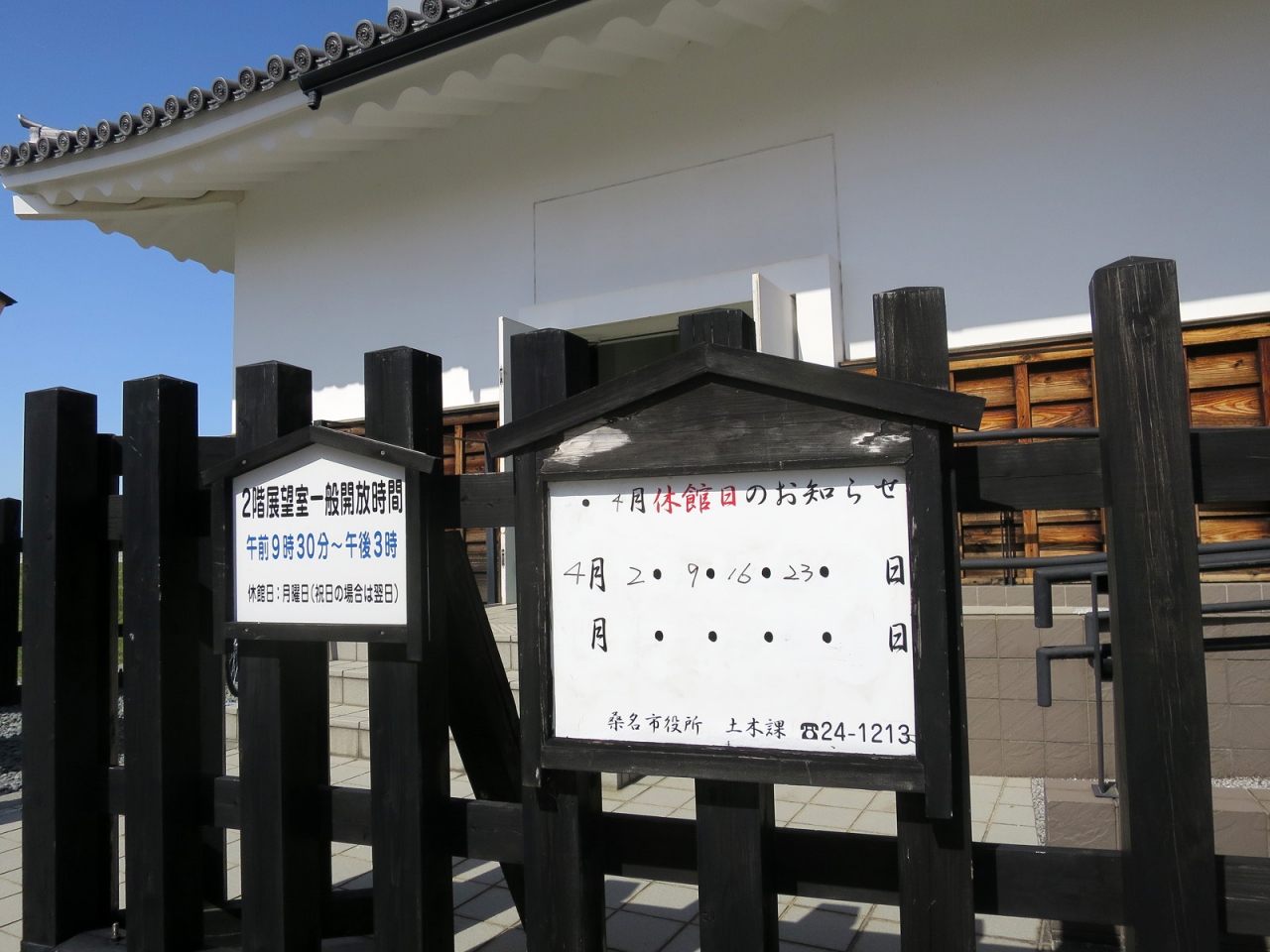 「七里の渡し」、その桑名側の渡し場です。甚大な被害のあった伊勢湾台風もあって、渡し場辺りは頑丈な堤防で覆われていますが、その内側に造られた水路の一部に、当時の渡し場らしい石垣(未確認です)が残されています。その水路の最深部に建てられているのが「蟠龍櫓」です。歌川広重の浮世絵にも描かれているほど、桑名の渡し場を代表するほどの存在であったようです。建物は平成15年に外観復元されたとあり、2階部分は展望台になっていて、普段は絵画などの展示もあるようですが、私が訪れた時にはちょうど展示替え作業中で内容は確認できませんでした。