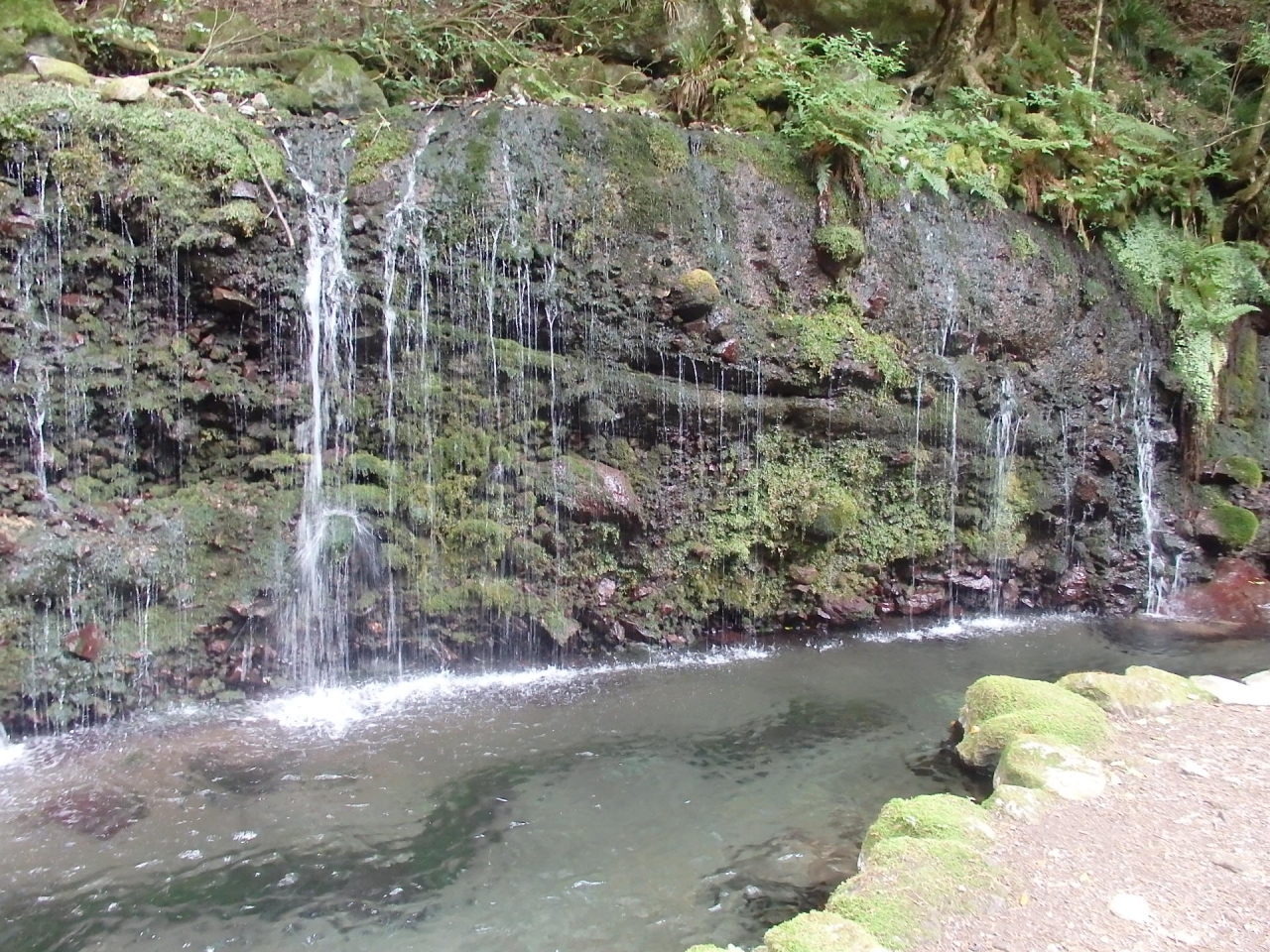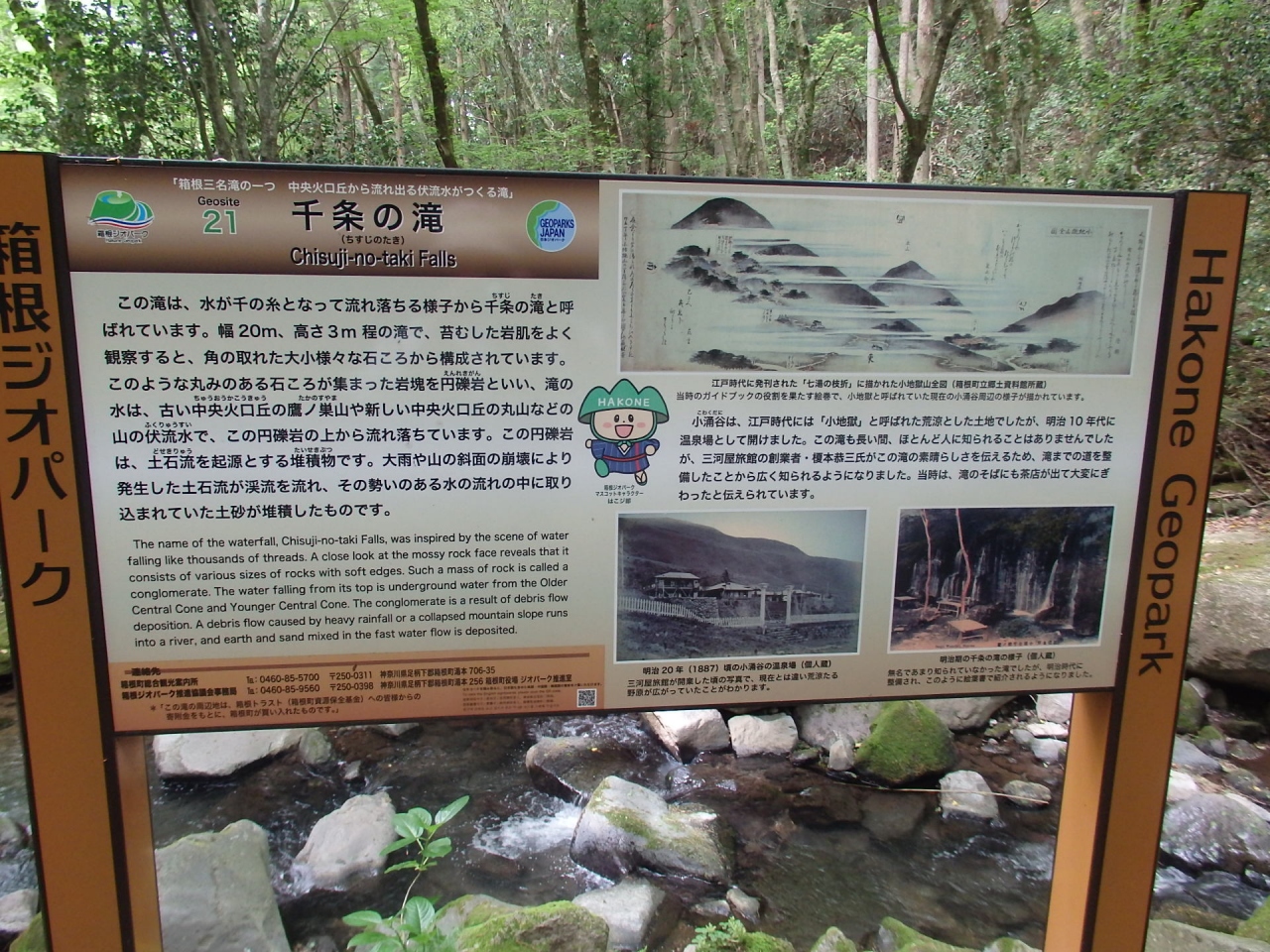 バス停畑宿から登って鷹巣山山頂を経て3時間40分千条の滝に到着(小涌谷駅から徒歩25分)。苔むした岩肌を伝って流れ落ちる様から「ちすじの滝」と呼ばれる。午前中に見た落差25メートルの飛龍の滝をおとこ滝にたとえるなら、落差は数メートル、細い幾条ものすじが流れ落ちる様子はおんな滝と言える。滝壺をえぐるような強い流れではないので静寂を感じるスポットでした。山道が苦手な人は行くにくいところです