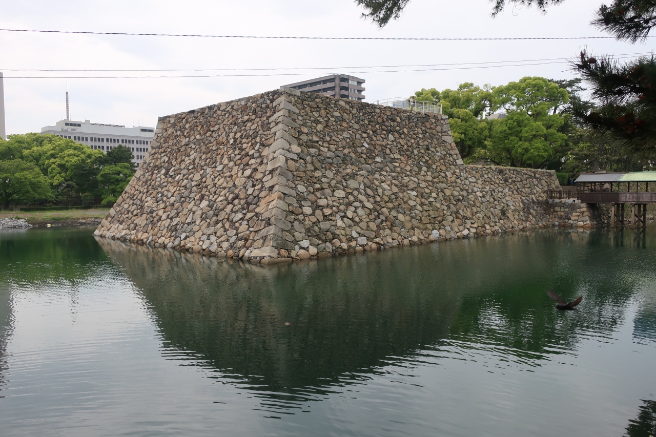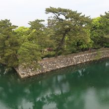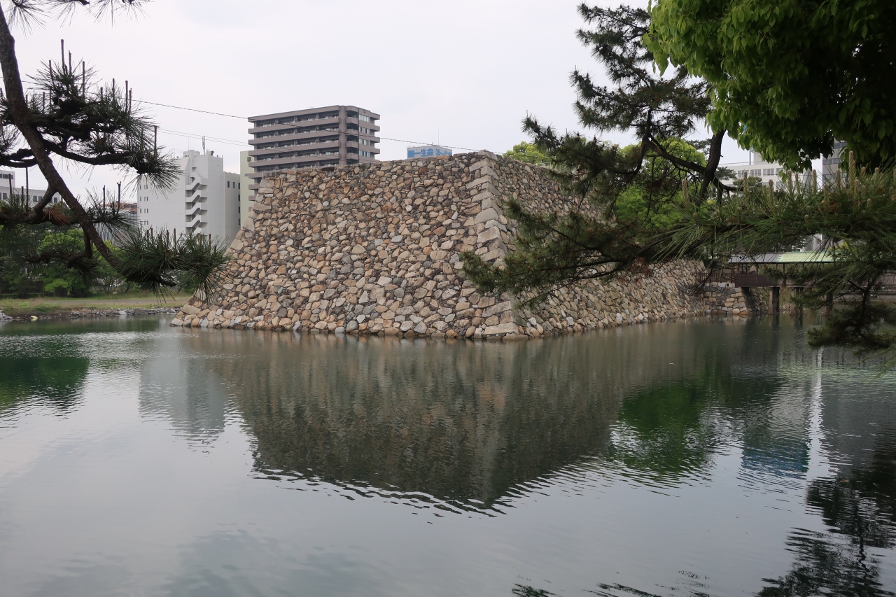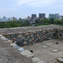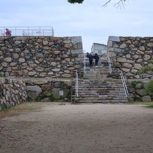 玉藻公園の鞘橋を渡った先にある新しく作られた様に見える石垣が高松城の本丸天守台です。天守台には上がることができ、上ると外からみると分かりませんが、掘り下がった地下に天守閣の礎石が残っています。そこから石垣の上に上ると玉藻公園の全景の先に内海を見渡すことができる絶景ポイントです。