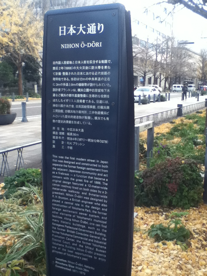 日本大通りは、横浜スタジアムのある横浜公園付近から北東のみなとみらい線の日本大通り駅方面へ延びる通りである。週末、観光客がかなり歩いていた。お勧めの点は、横浜公園と象の鼻波止場を結ぶ街路がイギリス人建築家リチャード・ブラントンによる設計で日本初の西洋式街路として、1870年(明治3年)が整備されたこと、このガイドが日本大通りと名付けられたこと、通り沿いには神奈川県庁本庁舎、横浜開港資料館旧館、 横浜地方・簡易裁判所などの歴史的な構造物が並んでいること、これらの構造物を見ながら散策を楽しめること、秋には紅葉が綺麗な景色を楽しめること、周辺にはレストランやカフェもあり食事も楽しめることである。